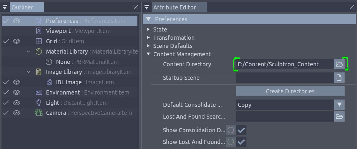 When working in Sculptron, is now important to define a content path for the current project: Click on Create Directories will create the proper folder structure where data will be stored (Objects, Caches, Images and so on).