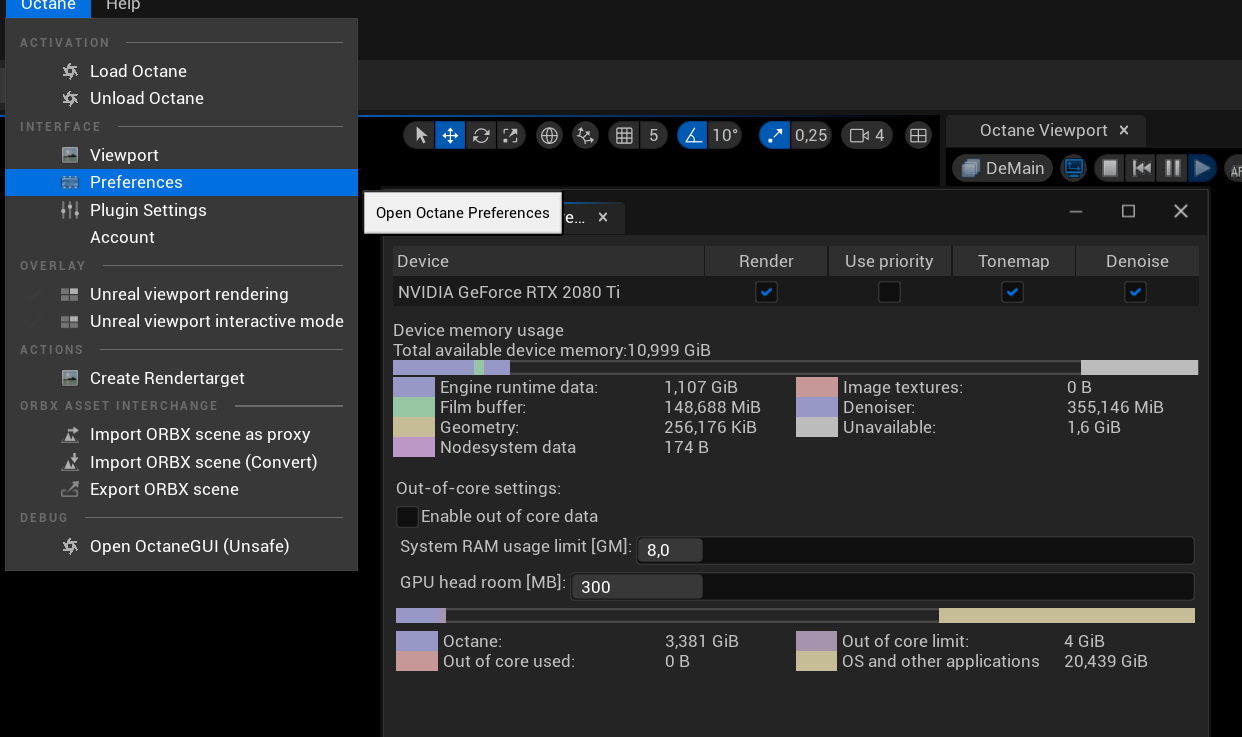 For some reason, Octane throws up a Video memory exhausted error in UE5's viewport (not the Octane Render View), once I fire up Octane. I've gone through and deactivated all geometry, then added it back in one after the other, but the findings are inconclusive. Of course everything runs well, when there's almost nothing in the shot, but once you load ever so slightly more complex scenes, it becomes a game of roulette, in which Unreal will suddenly decide that the video memory is exhausted, meaning the editor will either crash or become so sluggish that you will have to force shut it, in order to regain control of your PC.