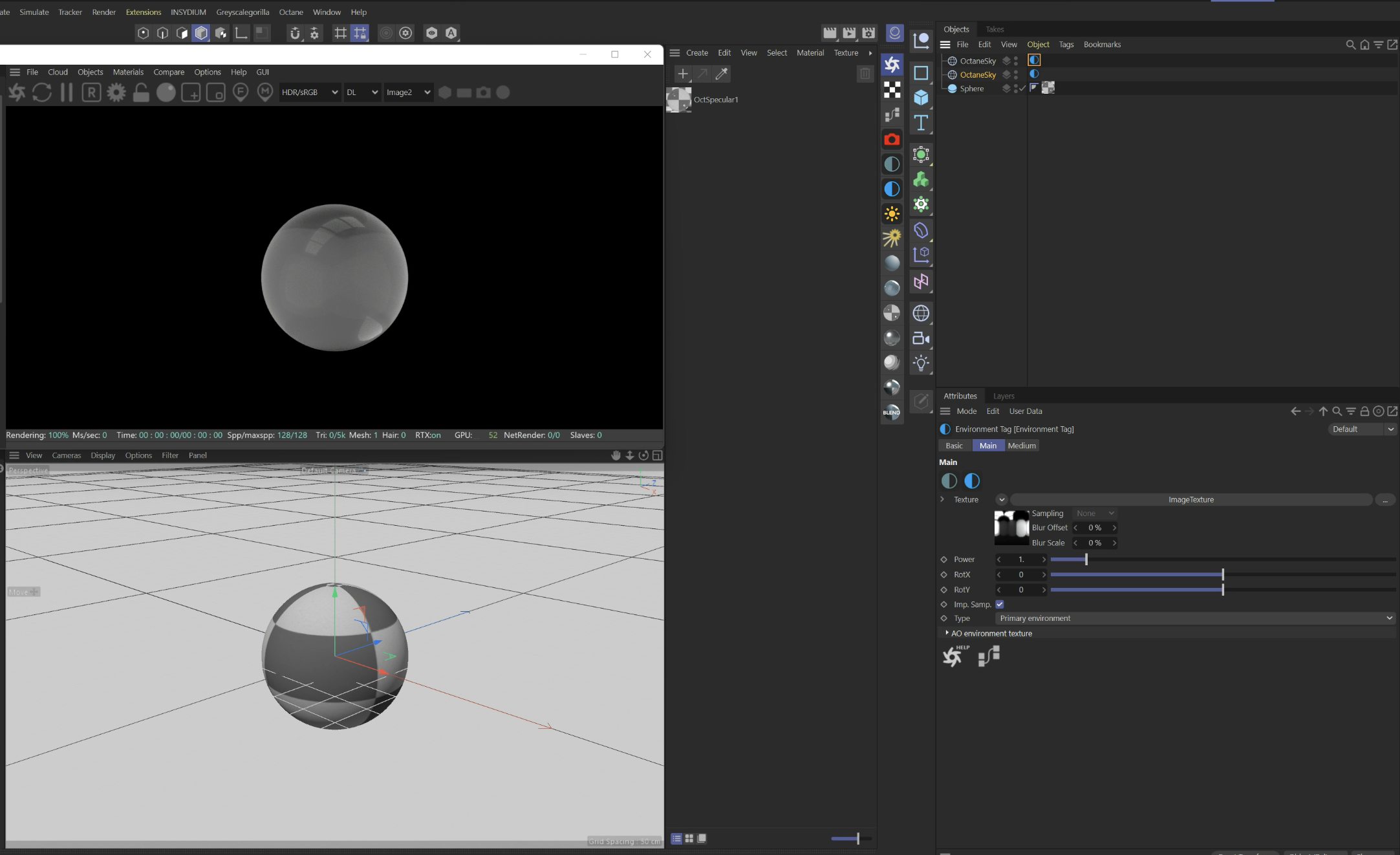 I have a black background, and assigned 'Octane Specular' to a sphere. My assumption here is that it's entirely transparent like glass.