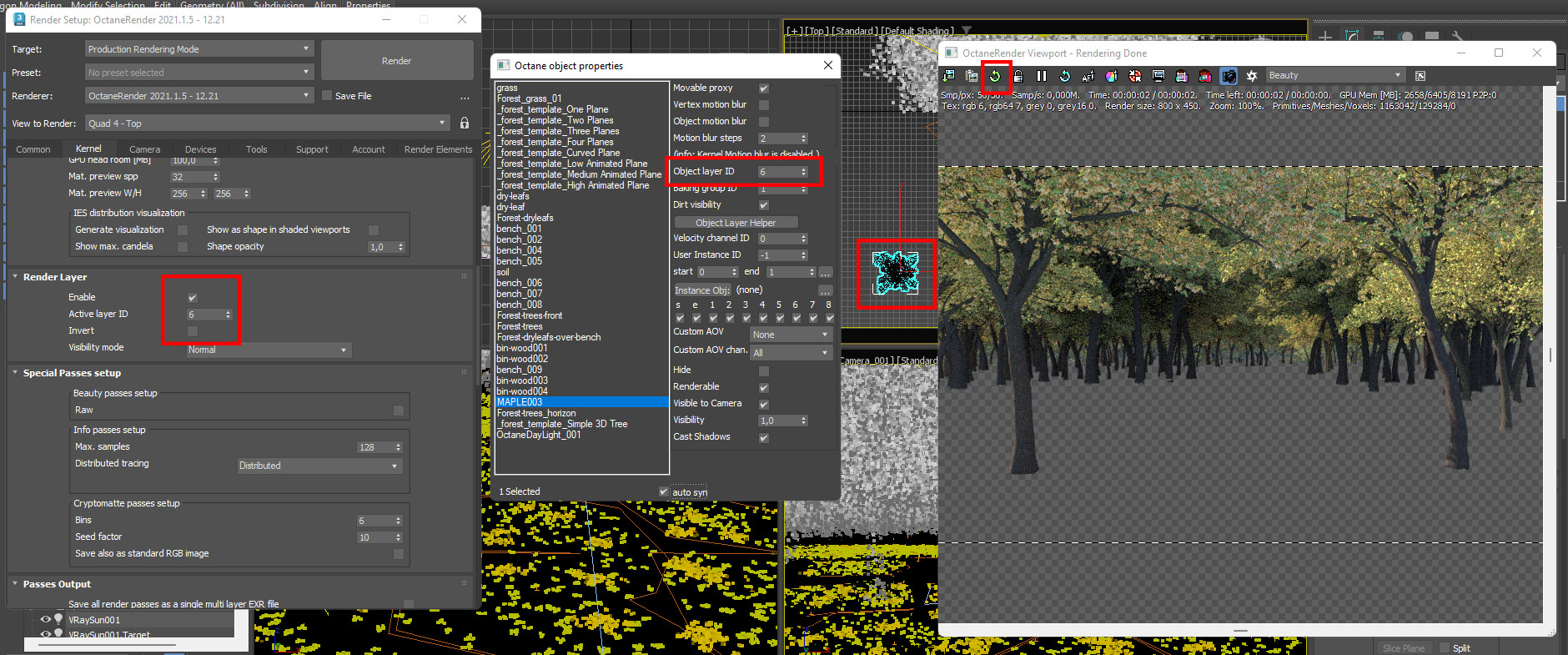 If you just open the Octane viewport and set the current pass to Render layer ID, you should get this: Note that in Render settings / Support / Forest pack, the 'Use layer from FP object' is enabled, so it will use the layer ID from Forest001 (layer ID 2).