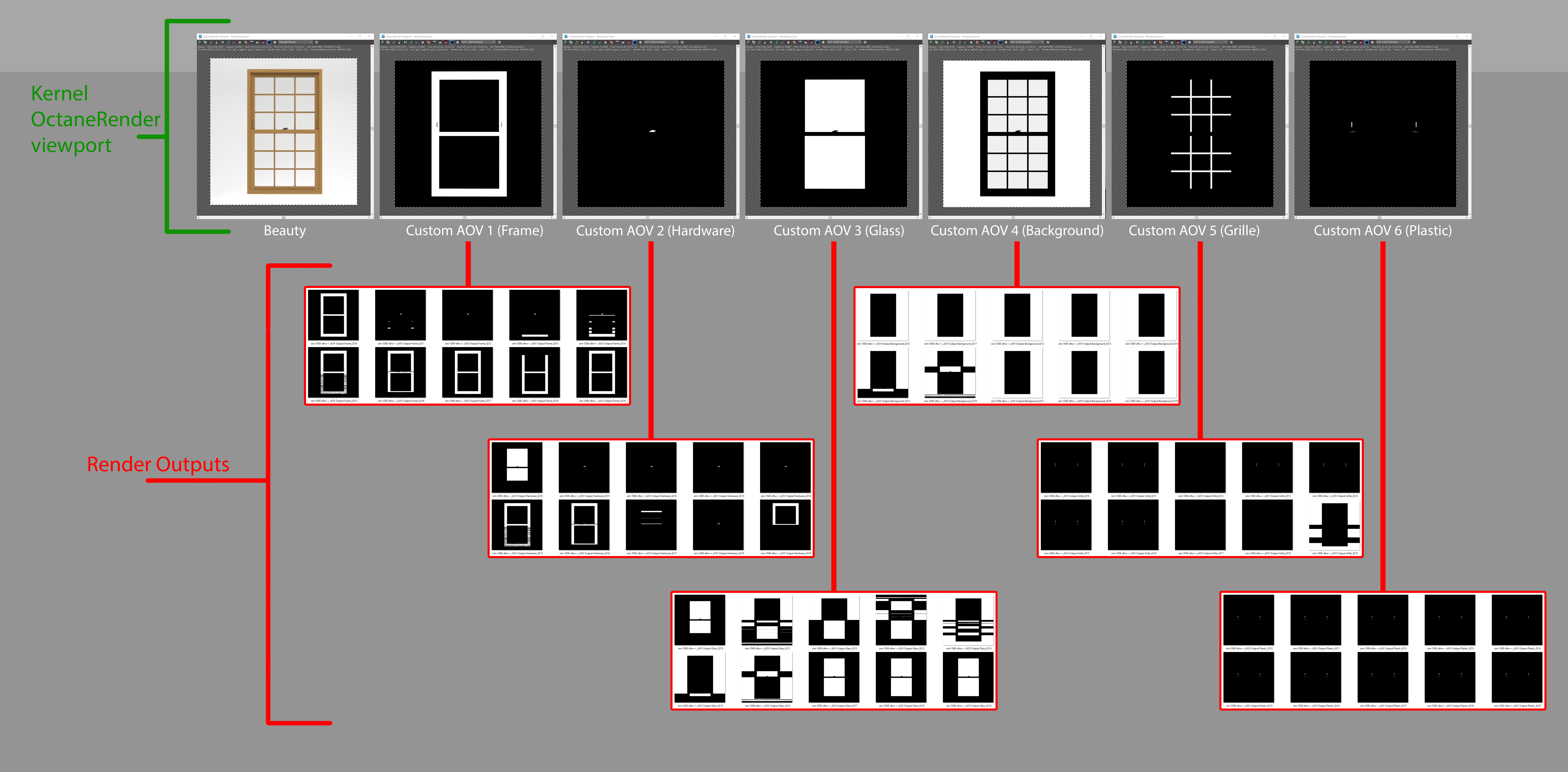 - I have 6 AOVs using "Render AOV output" to mask -- frame, hardware, glass, background, grille, plastics