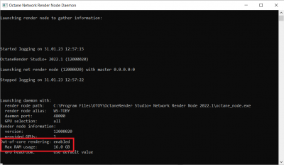 Hi. I'm not very familiar with the network rendering feature, but I don't think it's likely that this issue is specific to the Daz plugin. Have you tried exporting the scene to an orbx file and rendering from OctaneRender Standalone? Check that the render node is configured to use OOC - this is a separate configuration to the setting in Daz Studio on the primary machine. I just tried it now and when I run _install_daemon.bat to set up the render node it asks some questions, including whether to use OOC and how much RAM to use. When I run the daemon, it shows a window like this:
