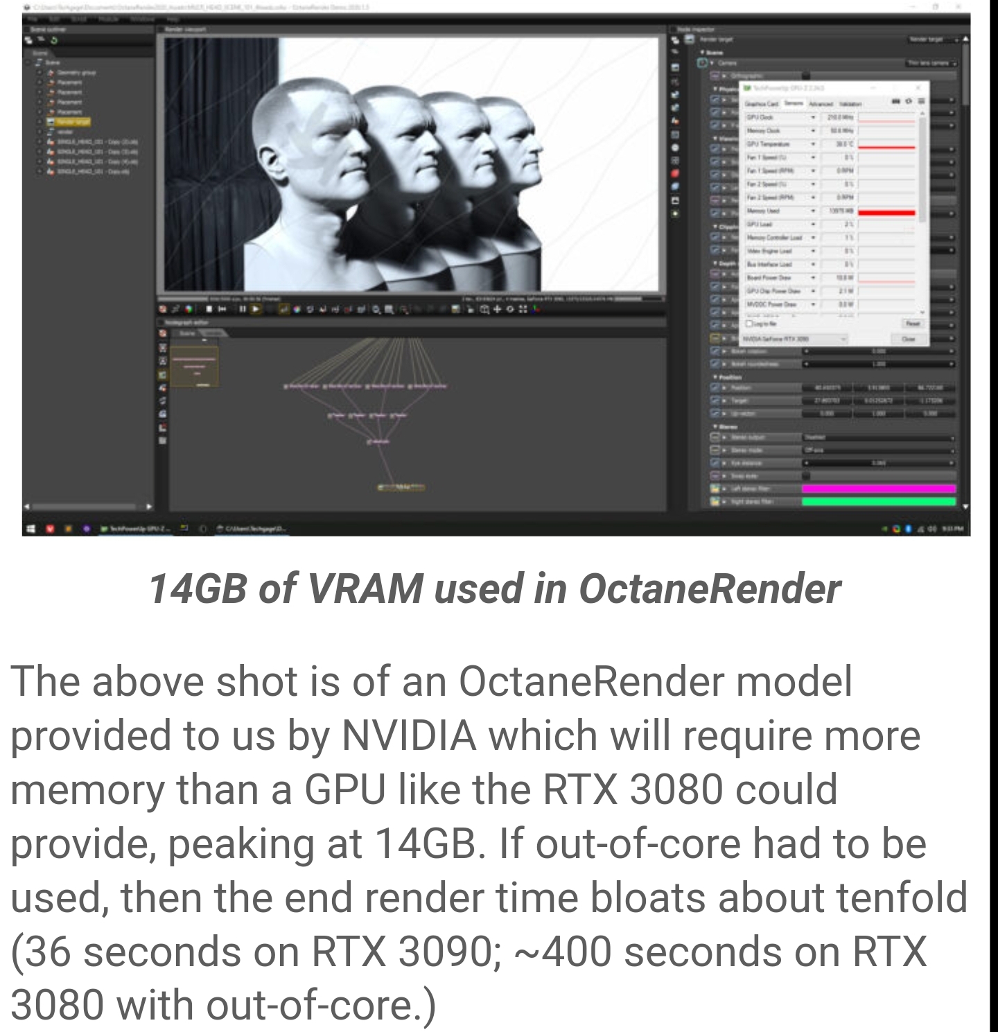 yeah its interesting - I am not an expert by any means in this area, I am relatively new to Octane and all ears for new information. I don't want to speculate on the article but its basically the same as what I ran into. I am sure there are many variables, of which I am one, but the the massive drop off in speed prompted me to look into this - and I am really only sharing my experience to hopefully help someone else - instead of saying "long held belief" I should have said, "everyone is telling me RTX is disabled with OOC" but having done quite a bit of testing and going back and forth with some of the devs, as of right now, when correct settings are used, I no longer have the insane performance drop. its pretty easy to test actually, if you have a scene that requires OOC, you can enable and disable RTX in the device settings and see quite clearly there is a difference without it. Definitely there is a performance hit when using OOC, but from all that I am seeing that is not the same as the Non-RTX performance hit. what I can add to this is, and please note I am not saying this as objective fact - when I was doing these tests, I noticed that if some other event was triggered during the render, I would then get the massive performance drop - like 10 min to 10 hr kinda drop. one time this came from me opening task manager, another was a screen saver being activated. - I don't want to push any mis-information, I am sure I don't have the whole story, just relaying my experiences. in my case I am doing this testing with 2 3090 FE's and 1 4090 FE. - and just to note, 3 cards running with OOC is faster than 2 cards with NVlink. (but this of course depends on the cards being used) the experience that prompted my original post seems to have come from running out of system memory - when I had the scene fully loaded I was around 118GB of system ram being used. when I rendered it in standalone, far less system memory was needed and the render time was "normal". again, I am no expert, just sharing information given to me and my own experiences.