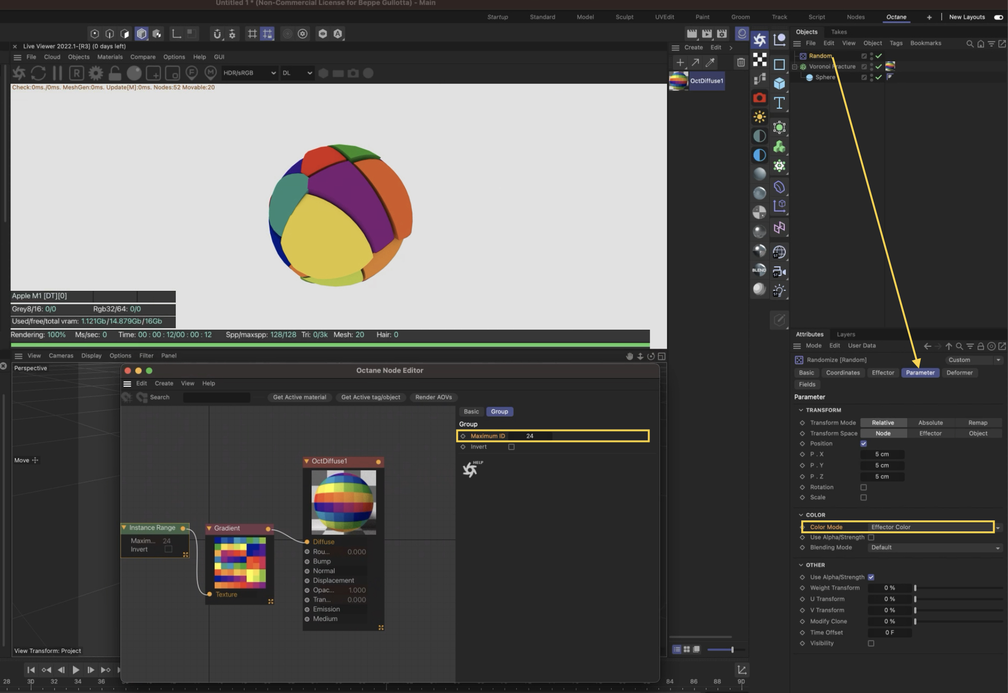 Random Color node works only with MoGraph in Render Instance mode or Octane Scatter.