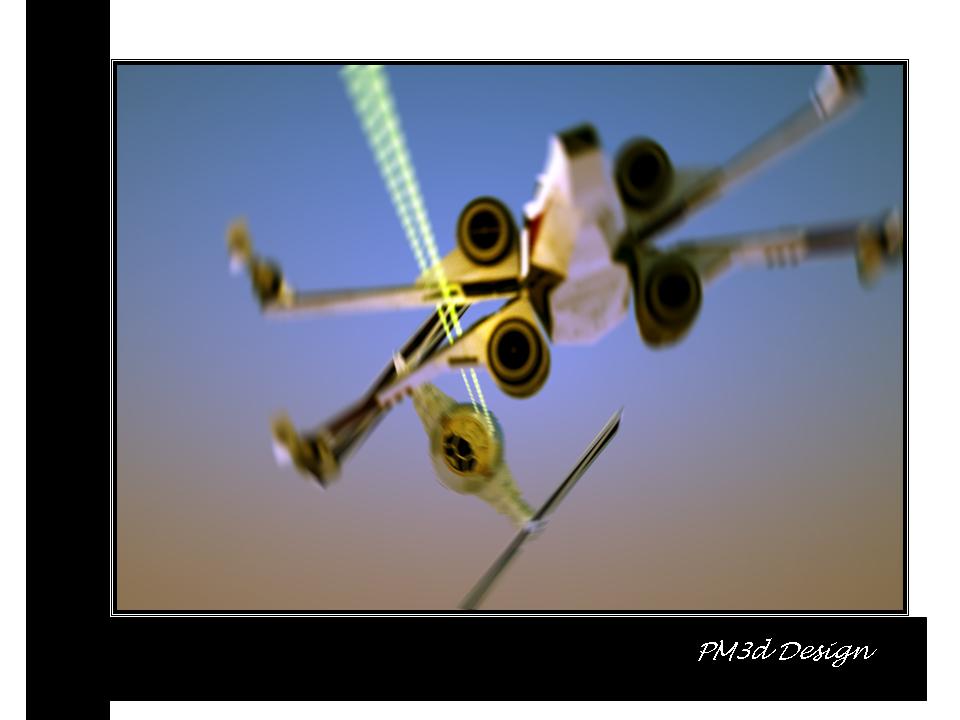 This is an action shot Ive added radial blur to give the swivel action as the tie fighter fires and the x-wing rotates to avoid his plasma. models from 3d warehouse and rendered in octane with slight rotating blur in paint. hope you enjoy