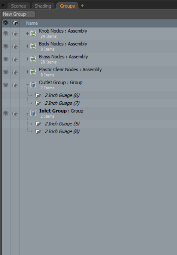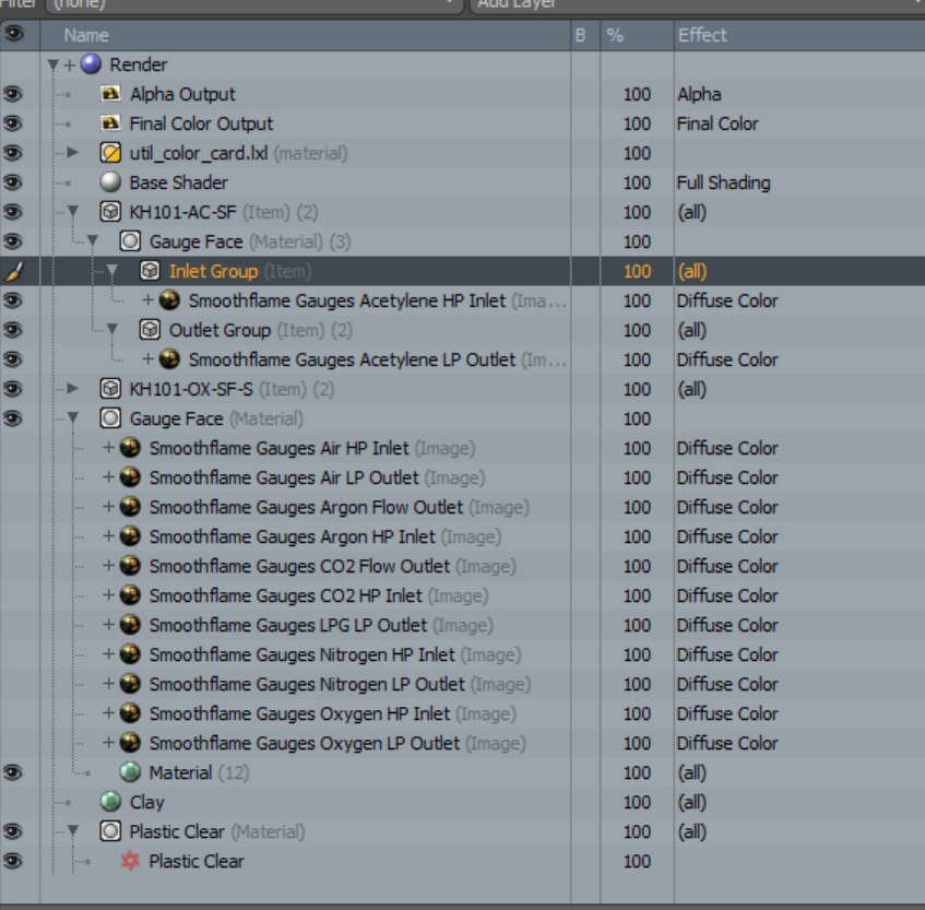 I have a setup I use in modo often where I have an item with a base material assignment, then that is instanced among various mesh groups. I use the same mesh with different graphics by creating a group in the groups panel and adding specific instances to the group. Then create a shader item mask for the each group and add any override materials to those groups. In this case I have a pressure gauge that is part of a regulator. The gauge is the same for inlet and outlet, except for the graphics on the face. The gauge is also used on 9 different SKUs. So normally I would have a shader item mask for the SKU, and in that an item mask for the face material, and in that one mask for inlet group and one for outlet group. I just place the relevant face graphics into each folder and works great. It seems though that Octane does not recognise the item mask on a group. Even if I drop them down into the base material they are ignored. The material is Modo, no Octane override.