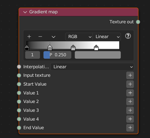 1. When you create a gradient map node it comes by default with only two flags, the start and the end but the node itself has 4 inputs, start, 1, 2, end.