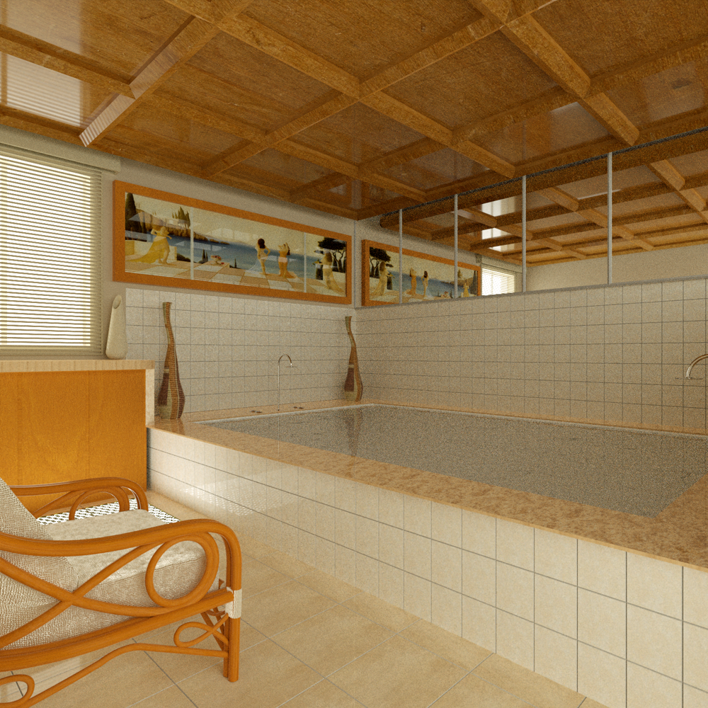 I agree about ceiling. It is just to strong mirror. Also i would put a bit more of specular intensity plus decrease roughness. You know that on wooden furniture you have that glossy transparent dye you put on the end. Add some bumps on tiles as well.