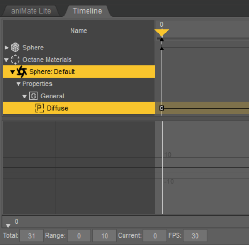Once a linked property exists for a node, any changes made to the node's value are reflected in the property and vice versa. This means that editing the node's value using the Octane node editor will create an animation key at the current scene time. These automatically-created animation keys can be edited using the DAZ Studio Timeline pane.
