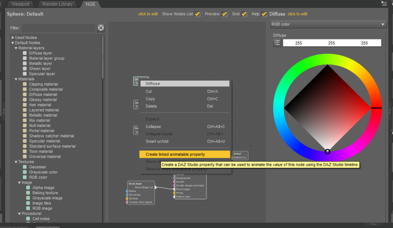 The new way of animating material nodes is through the ability to create DAZ Studio properties linked to the nodes and to use the DAZ Studio timeline to create the animation.