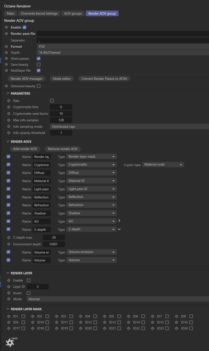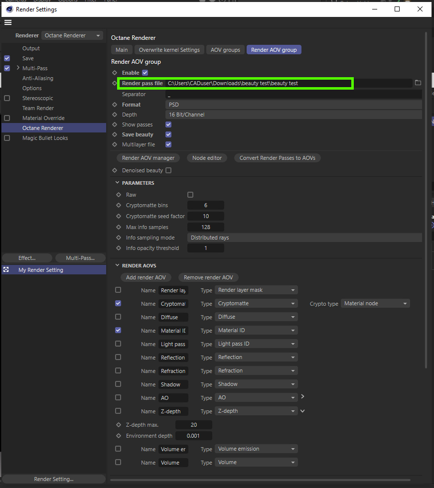 Please, share a screenshot from render settings/OctaneRender/Render AOV group tab, thanks.