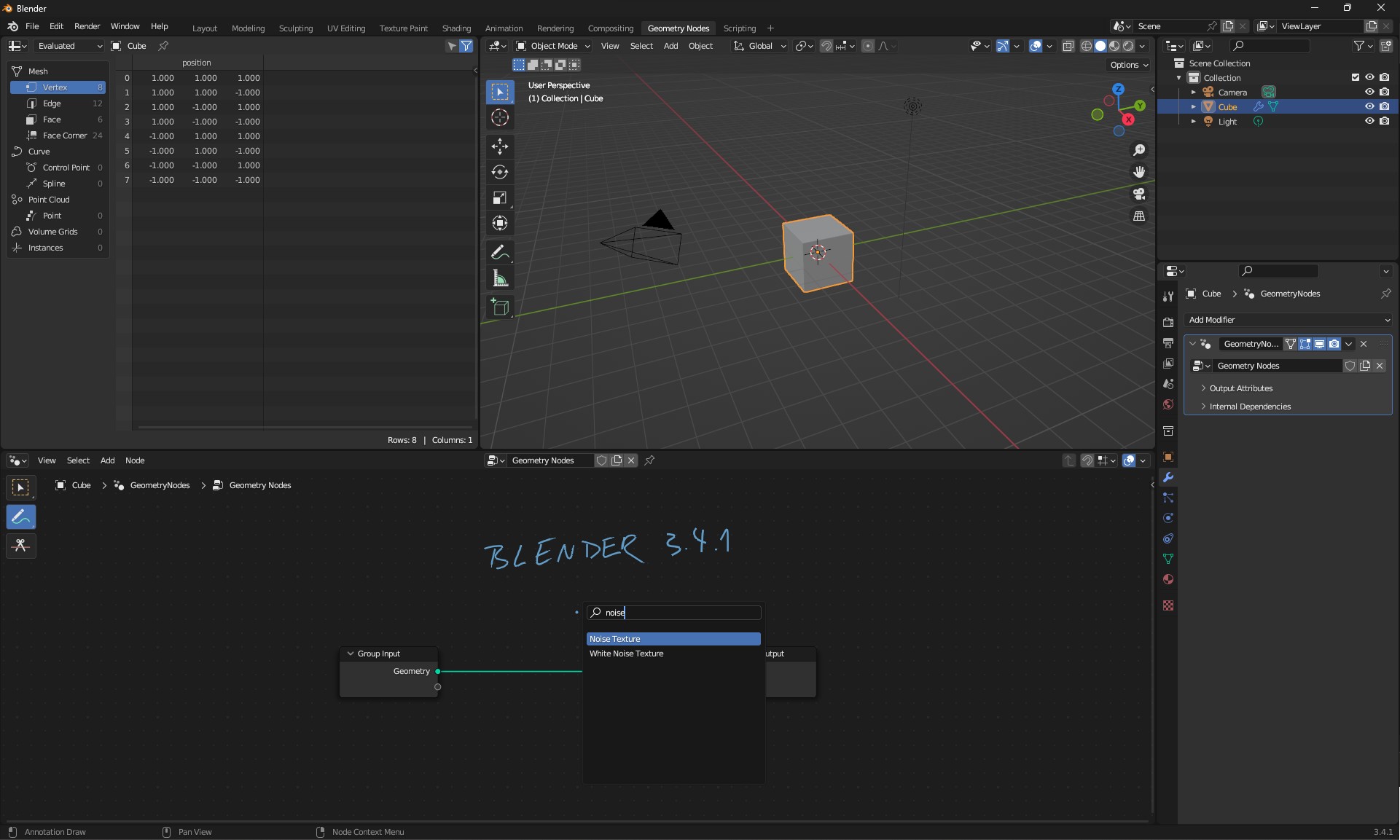 - create GN nodes modifier on default cube