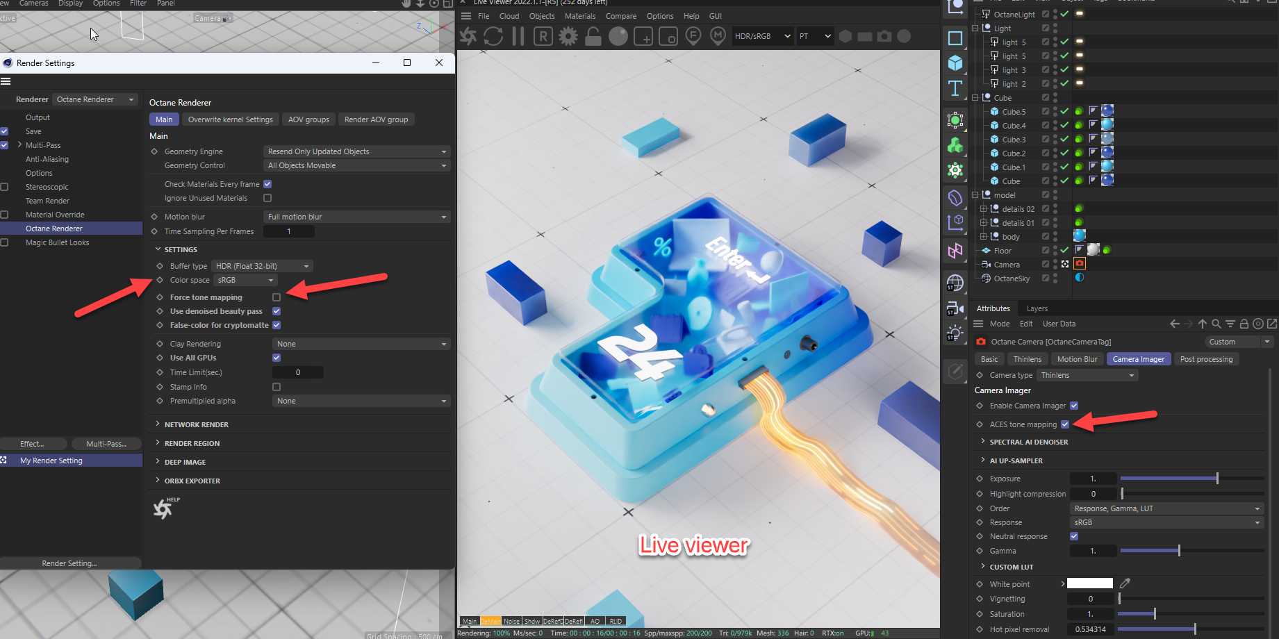 i turn on ACEs tonemapping in camera and turn on force tonemapping in octane render settings