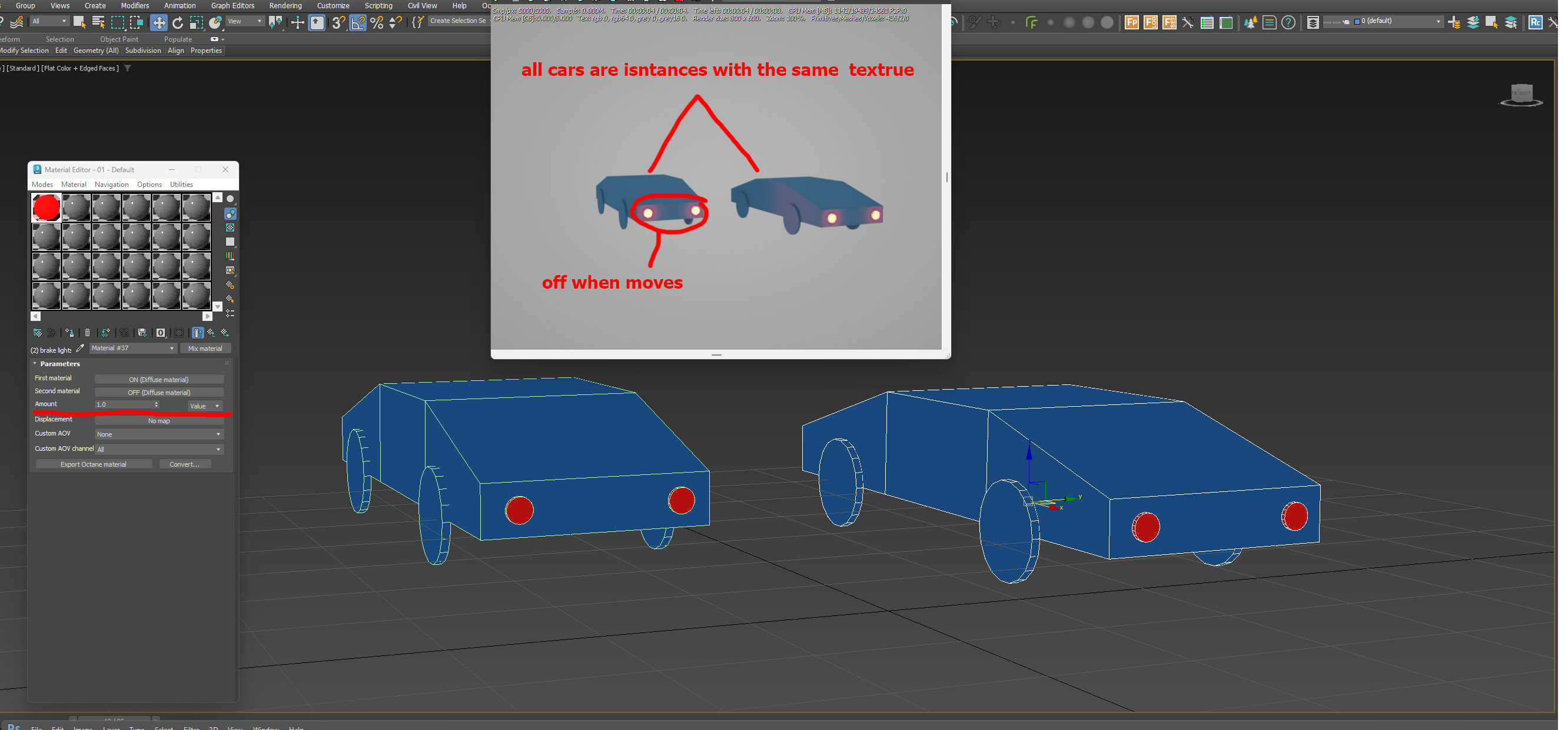 This is only a half formed idea off the top of my head, but what if the lights on the cars are actually a separate particle system that uses motion info to drive visibility/texture state? The cars themselves are still instances, so you get all the render benefits from that, but each light or set of lights has a unique particle ID and can behave independently. I'm not a 3DS Max user, so exactly how you get the light particles to coordinate their translation and orientation relative to the vehicle instances is outside my experience.coilbook wrote: Thank you! Unfortunately I checked your scene and all lights are always off even after refreshing etc. In my case these cars randomly go and randomly stop so I cannot make a certain car as "Using Octane Object properties, select Box002, and set the Instance ID to 1 to use the light ON material, and 0 for light OFF" because later in another simulation it might go instead of being stationary.
