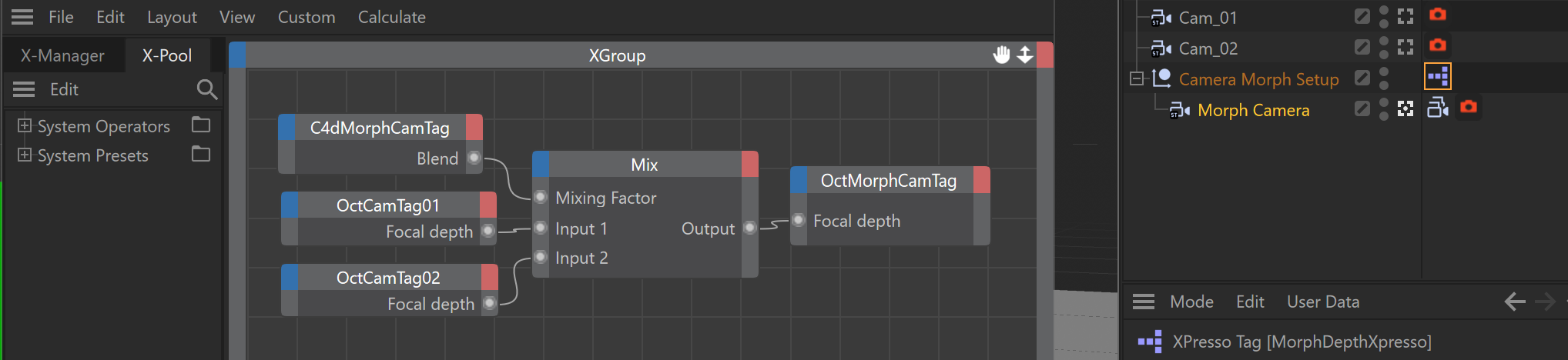 Another way to say it is that while the C4D Morph Camera is still handling all the 3D transformations, the ExPresso Tag is taking the Blend information from the C4D Morph Cam, mixing the Octane attributes the C4D Morph Cam can't access, then feeding the results to the Octane Camera Tag on the Morph Cam.
