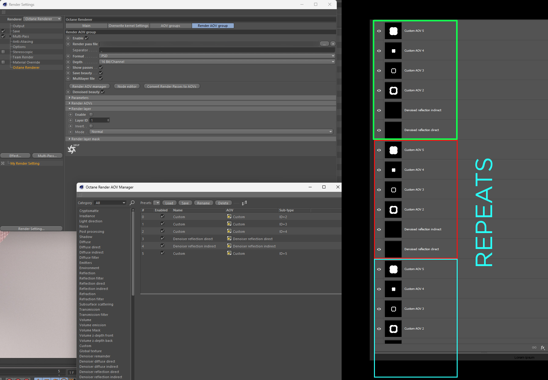 I am outputting files with numerous AOV. the photoshop file contains these multiple times so I have far too may duplicate layers.