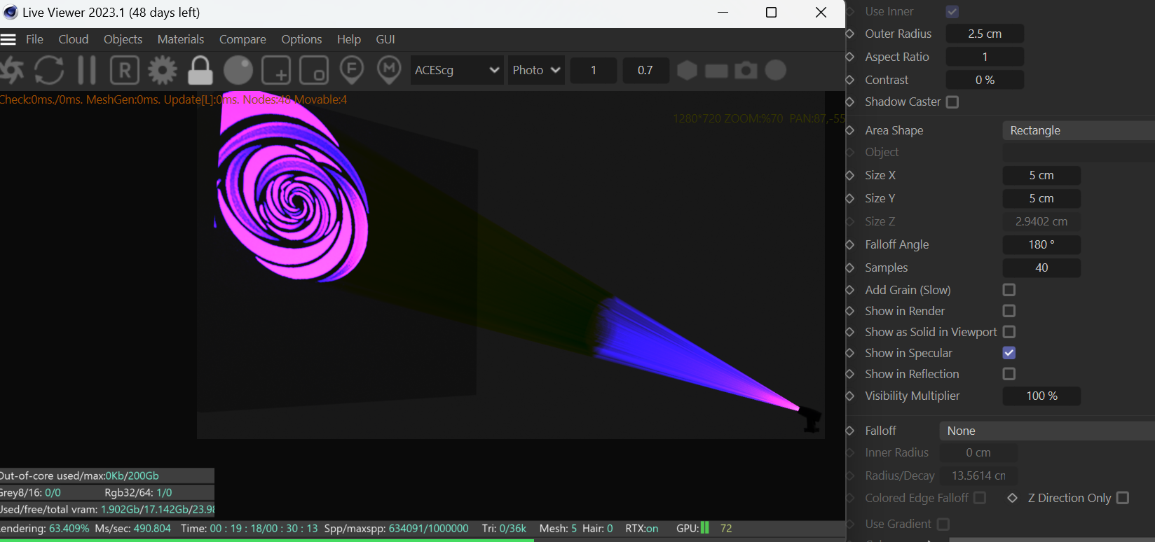 When the size of the Area Shape gets smaller (5cm x.y.) the Gobo will get more focused, but the light beams will stop mid way.