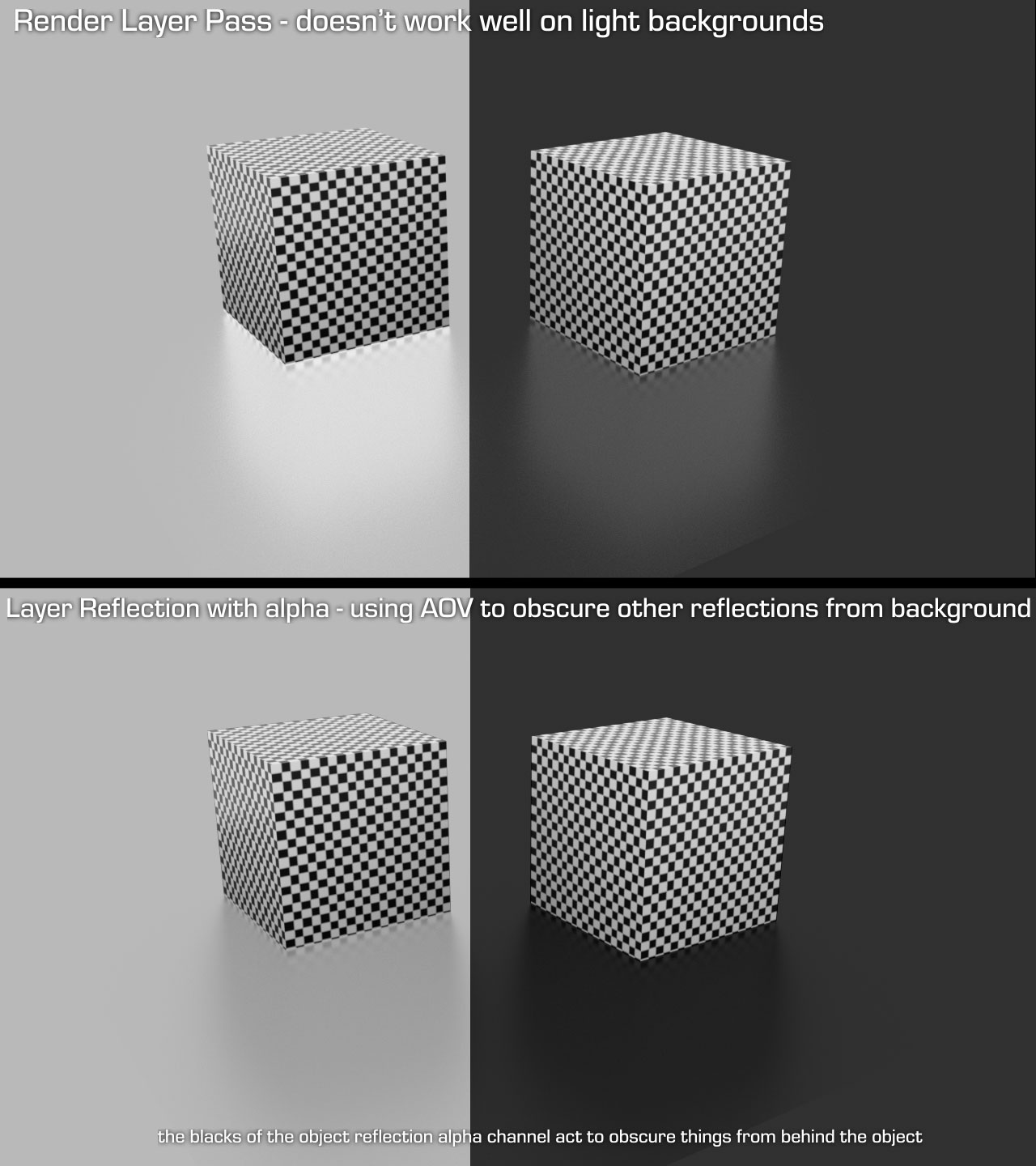 Thank you! I am hoping this shows how setting the reflection pass to add mode is not enough -- and why an alpha channel for the reflection would be INCREDIBLY helpful, or even the ability to render the reflection matte for that object (without multiple render settings/exports) Although it is currently technically possible to get the passes necessary... 'render layer' removes the reflection matte that is necessary from the AOV pass, making this a two-step render process