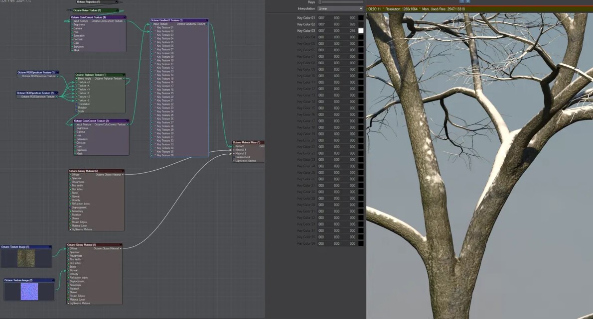 With a simple setup in Octane, we can get snow on a tree using a Falloff map which mixes bark and snow materials.