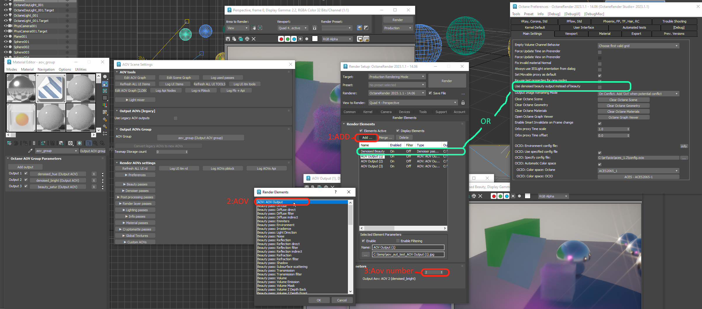 For the 'Use denoised beauty output instead of beauty', that's is the Main settings tab of the Octane Preferences.