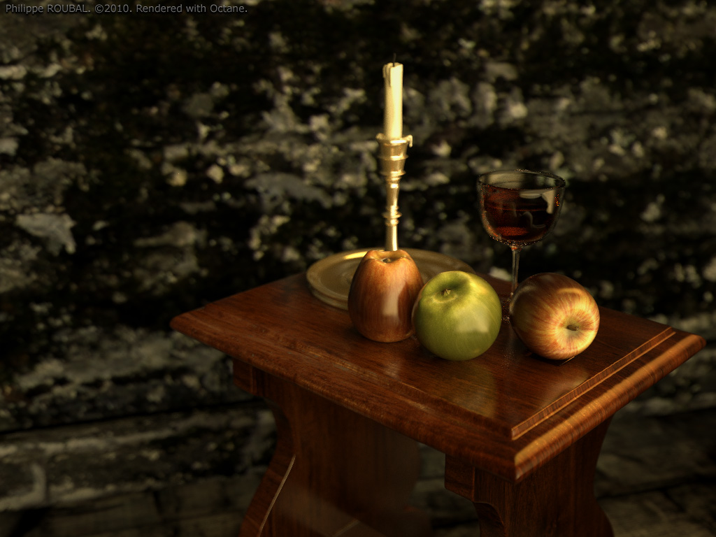 Freshly modelled apples and wine glass for the competition. Other models from a previous scene. Everything done in Blender as usually.