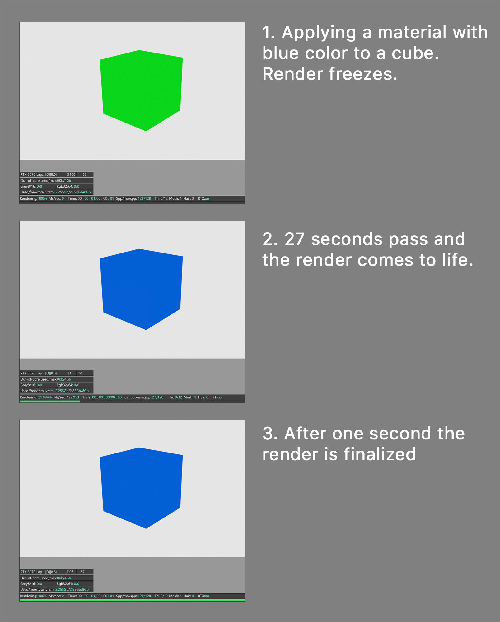Sounds like drunken nonsense. But for example, I have a scene in which there is only one cube. I create standard material for it. I apply it to the cube. I change the color of the material. And to see the color changes I have to wait an average of 27 seconds. After this time, as if nothing had happened, the color of the material changes. After repeated tests, the message “not enogh memory” came out. This applies to any actions with the material.