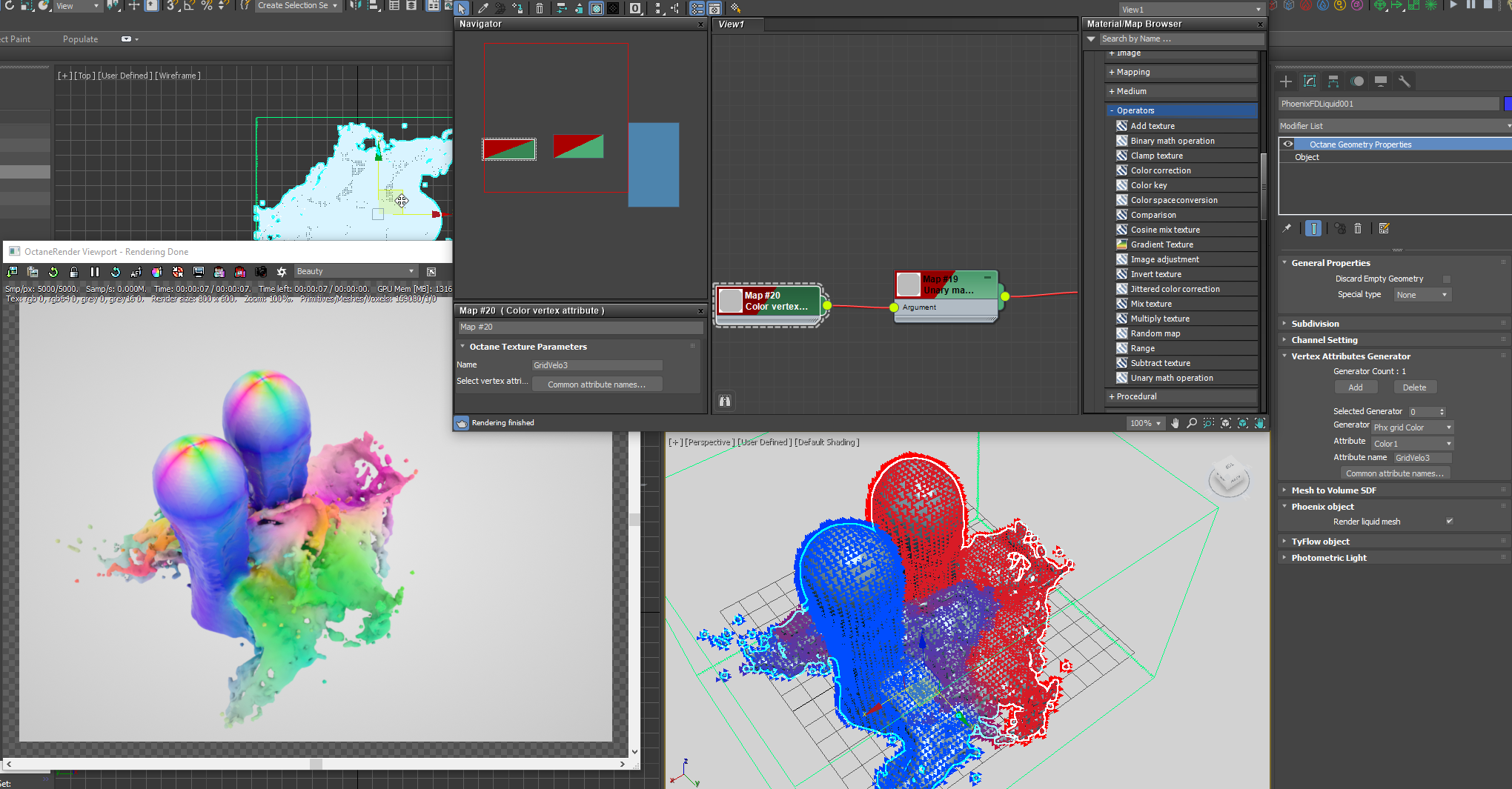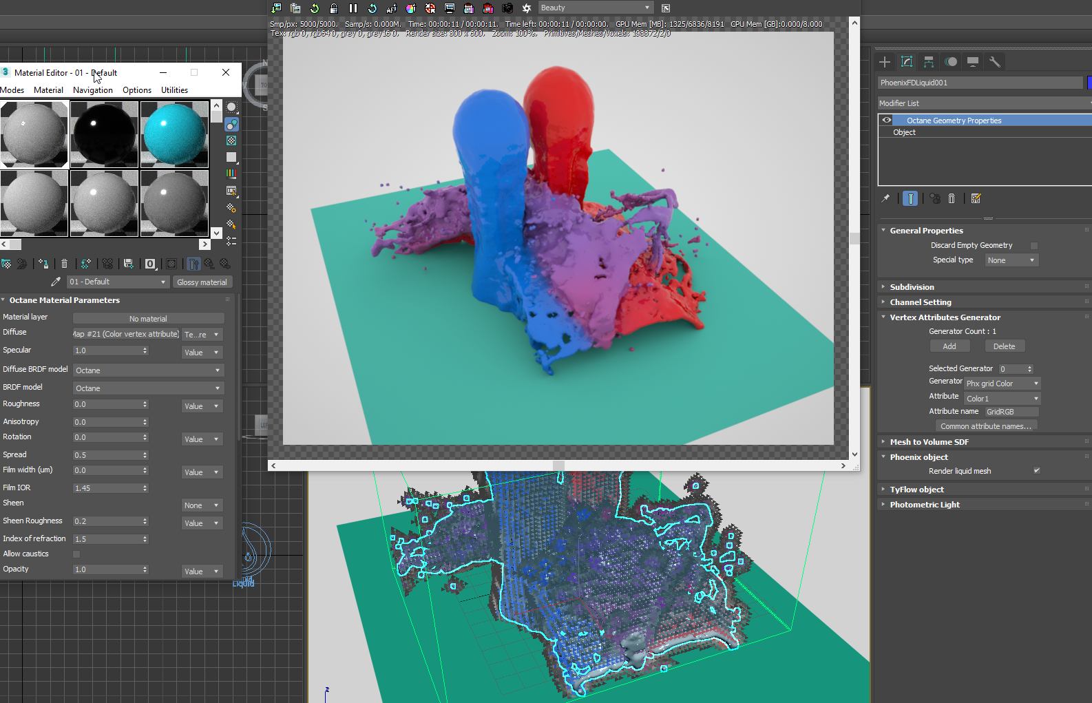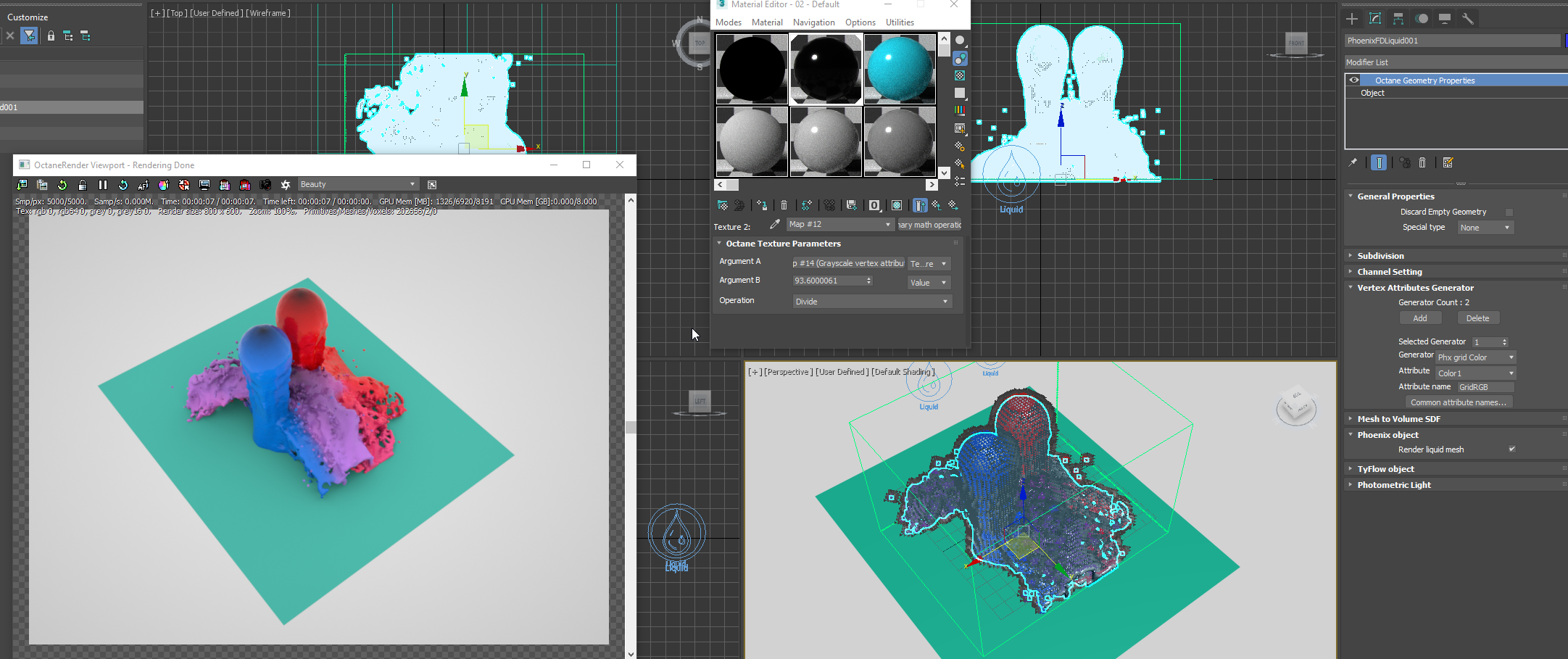 A new set of Octane Vertex attribute Generators can be used to read the Phoenix liquid grid to add Color data and other simulator data to the liquid mesh.