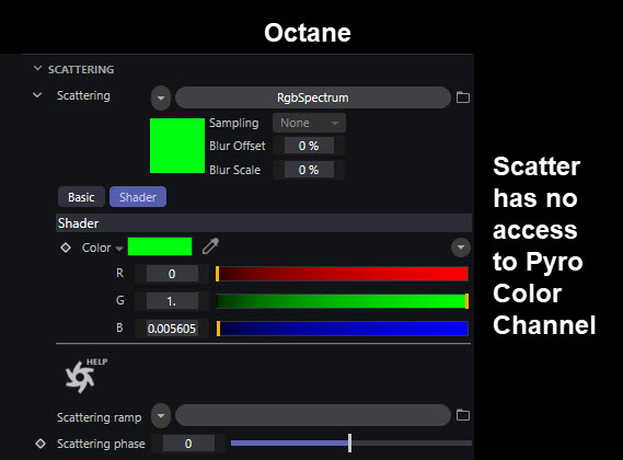 while an Octane VDB Volume's Scatter can only use the Density, and changing that setting to the Color channel in the Grid Mapping produces no result.