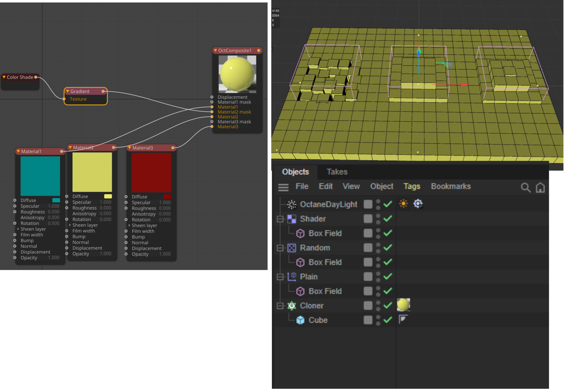thanks for the tip and reply. Im not sure am I doing it right. I want to achieve having multiple effector/filed driving 1 single color on a cloner. Each circle area represent 1 color each instead of random color