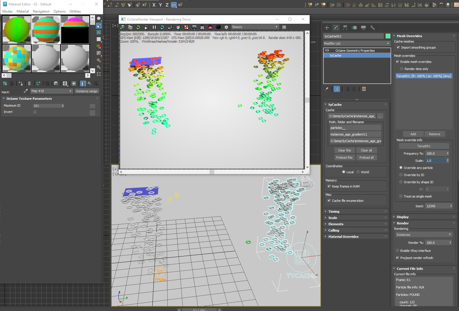 For the tyCache, we need to set the geometry to a similar torus created in the scene (Torus001), with the Mesh overrides panel.