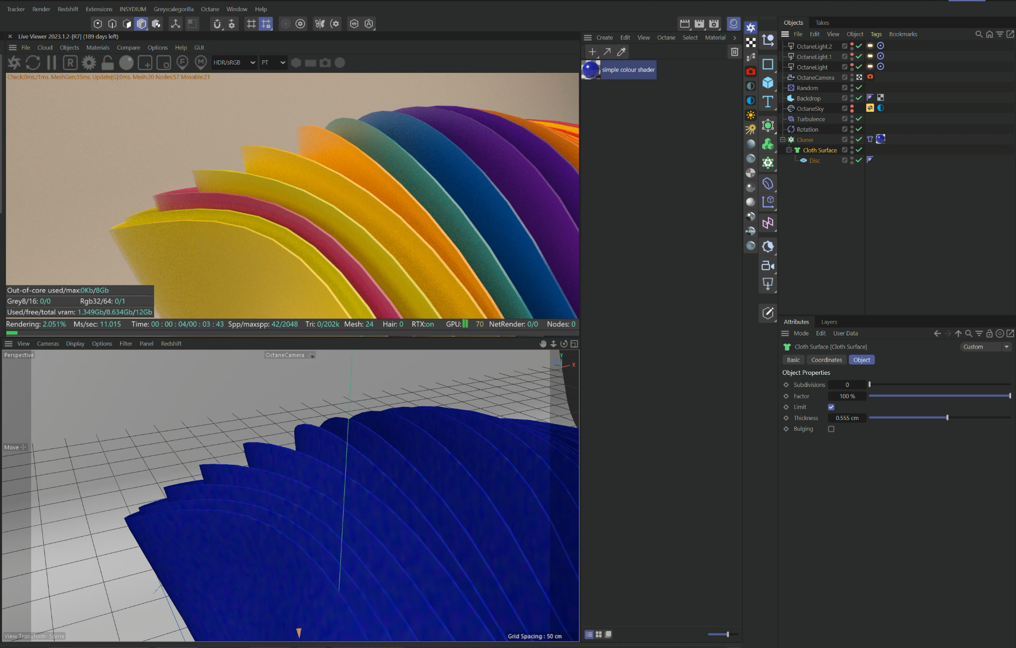 #jayroth2020 The Cloth generator is also providing thickness to the geometry, which the Octane Object tag doesn't provide.