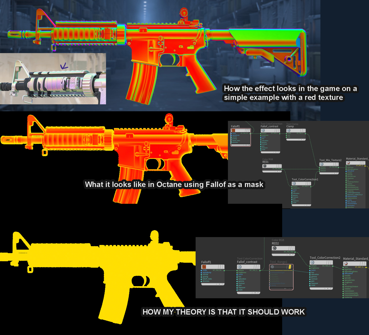 This effect is similar to the node “Octane Iridescent Procedural”, but it is also not suitable, because the result is not the same as in the game. It does not edit the original texture with HUE