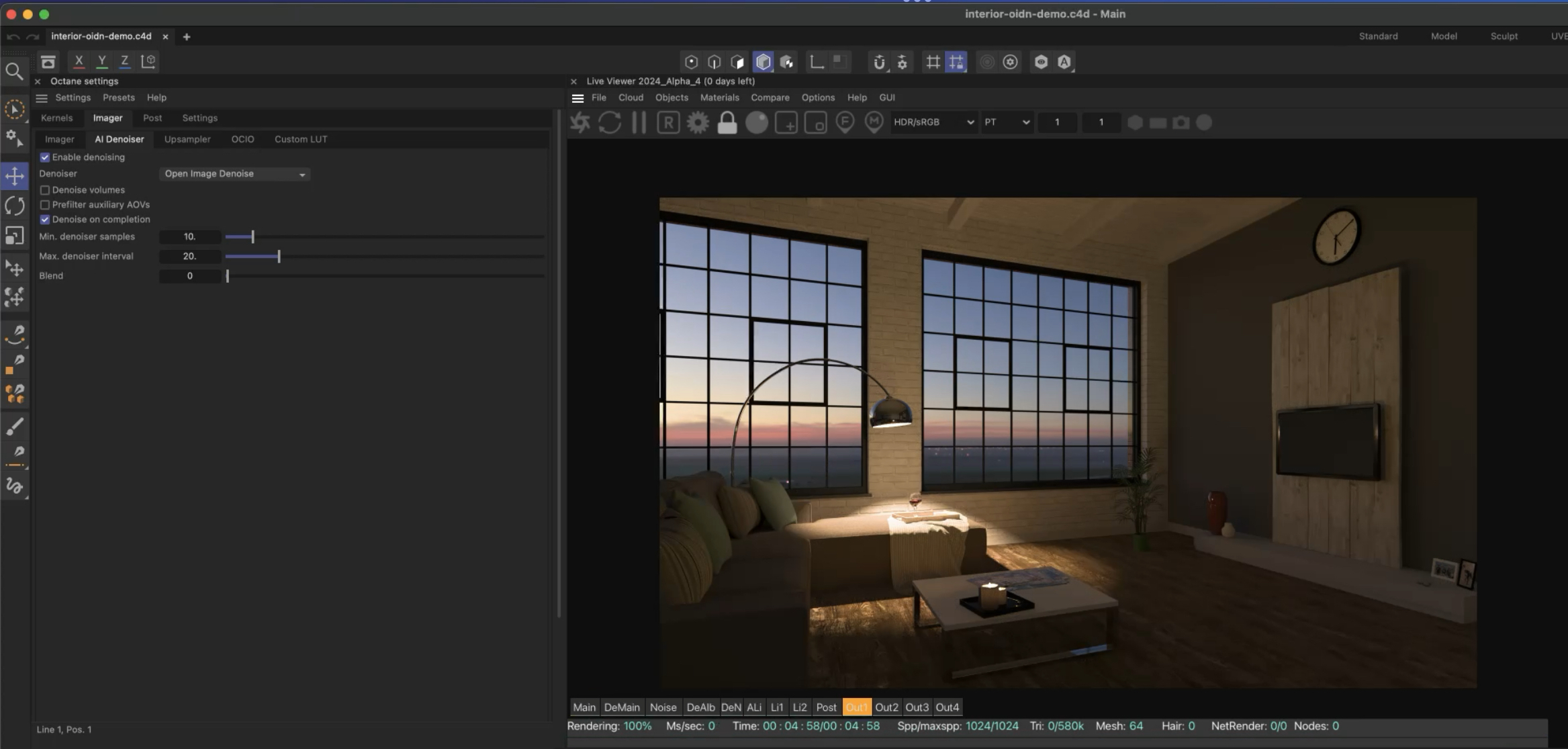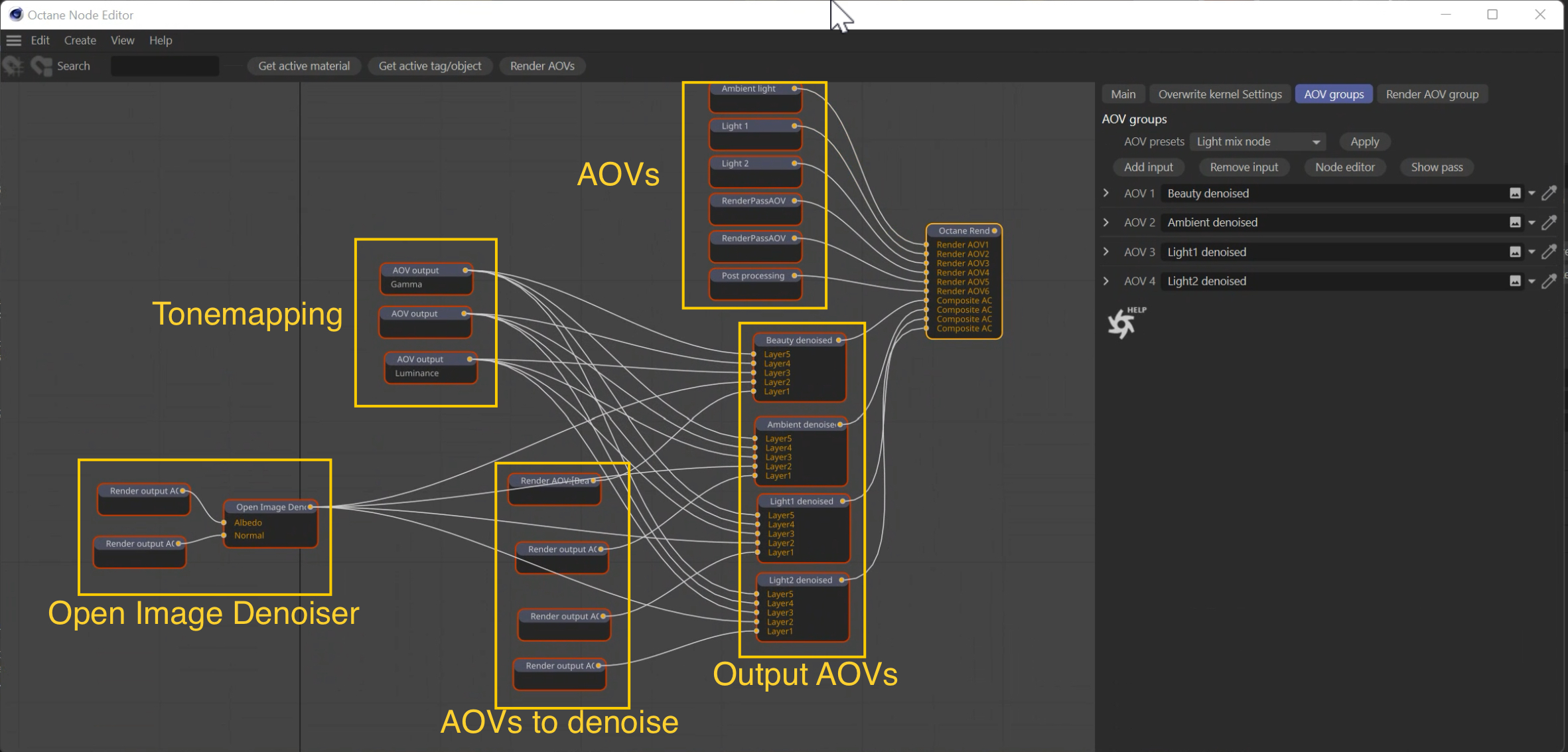 So I have converted the Standalone example scene to c4doctane, to better catch the differences in Render Settings - Node Editor: Basically, you need to create an Output AOV group for each AOV that needs to be denoised, then connect the AOV node, then the Open Image Denoiser, and on top, the tonemapping nodes: Here is the scene: ciao,