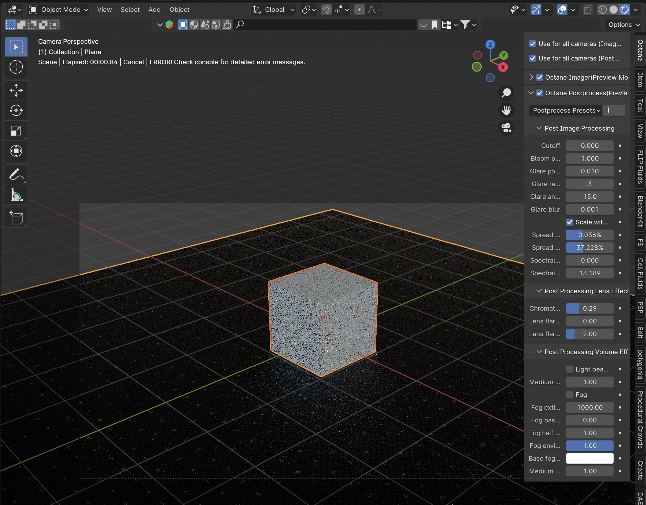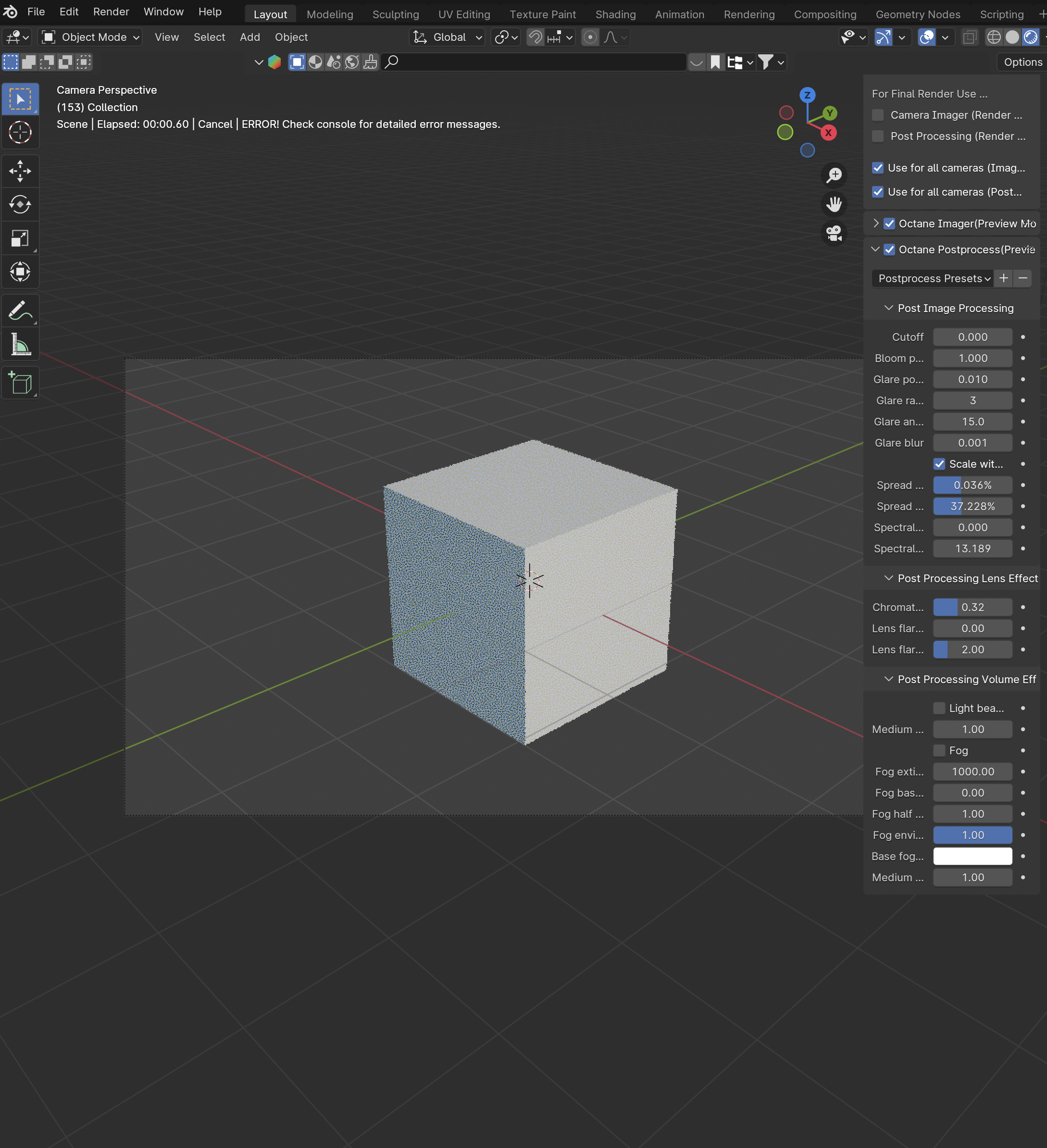 When I enable Octane Postprocess and trying to adjust Chromatic Aberration Intensity - an error occurs. It can be endless "Waiting for image...", or "ERROR! Check console for detailed error messages"