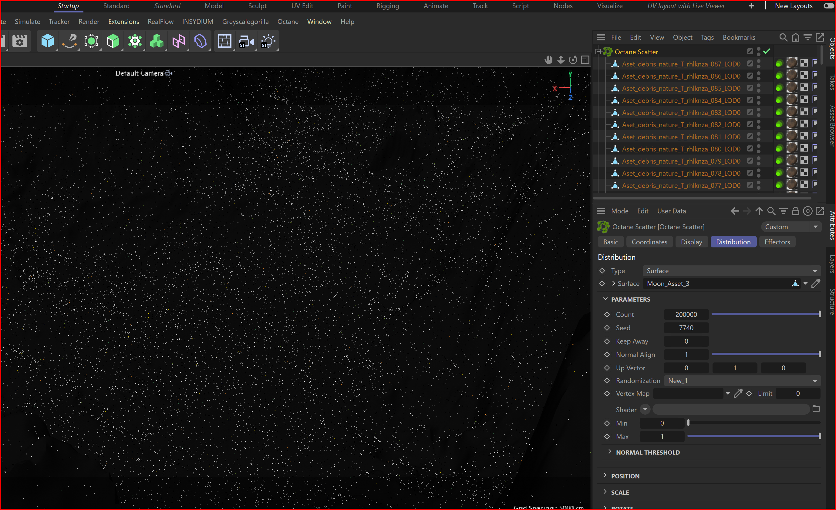 Hey Community hope you are all doing well so as the title suggests I'm having an issue with octanes scattering tool where it seems like it only scatters in perfect lines i have seen some post from pior years but i felt since this issue is still prevalent in the year 2024 and none of those old post were of much help we need an updated post on this issue now I don't know if this is because I'm doing something too ambitious for octane to handle or if it's the large plane that I'm trying to scatter on but I've been having this issue for the last handful of months where even when it's on Surface it will still scatter in these perfect lines so before some of you guys suggest these things let me tell you what I have tried mograph effecters such as random, plain, Shader all of which would cause the objects that are being scattered to elevate off object they are being scattered on to. Below you'll find some screenshots and a RAR file with the project in it