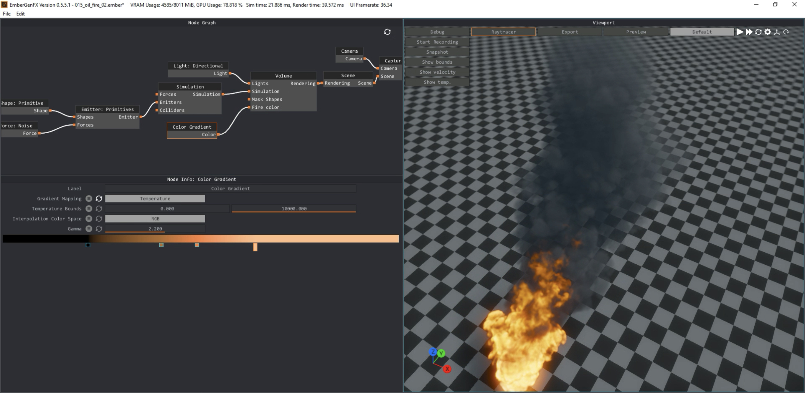 please share a screenshot from Octane Volume Medium node, and from Embergen color gradient of the fire.