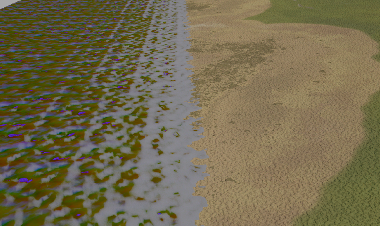 Basically I don't want displacement or very little near where water meets the edge. Using a dirt texture to mask where the water intersects with another object and a 128 grey value to for no displacement.