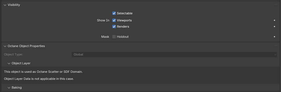 I always use the ray visiblity option for specific octane lights. For example if I dont want to see the lightscource by the camera I check the button in the octane object properties. But this is not working any more in the latest build 29.15. I get the message "This object is used by Object scatter or SDF domain" Its only by lights not by meshes. Does somebody know what this means or how to deactivate? thx a lot