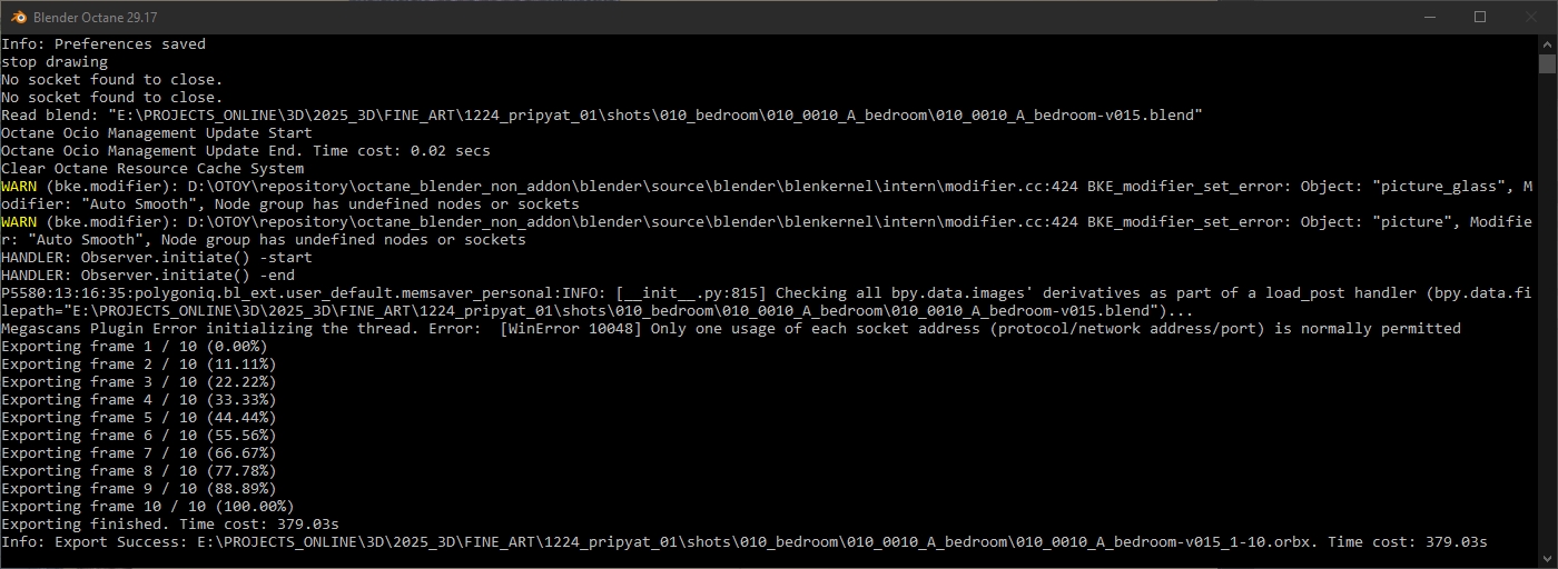 I'm using the custom build, Blender with Octane 29.16 ,the scene is a 1.49GB blend file, 288 frames total, and I've been trying to export only 1 frame to test it before exporting the entire frame range, but cannot get it to do even that. I've had issues in Houdini with trying to export a frame range different from the one set in the scene, could it be that if I have a range of 1-288 and try to export 1-3 instead of the full range that it causes issues in Blender?