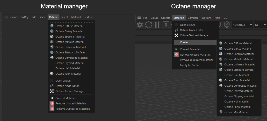 Hi, there there are differences in materials list. Octane window has them all but in C4D material manager there are missing some types:
