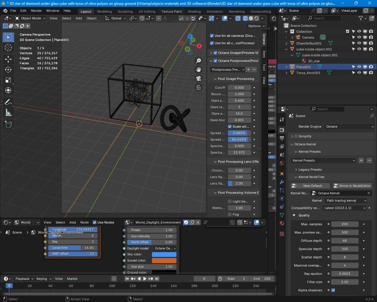 This image with 3D star@diamond inside cube@glass and green reflected torus at our sun source on the glossy floor@roughness of 0.03 is rendered by my GeForce RTX 4090 using Blender Octane Edition v29.14 and then OR 2024.1.1 Studio+ standalone: