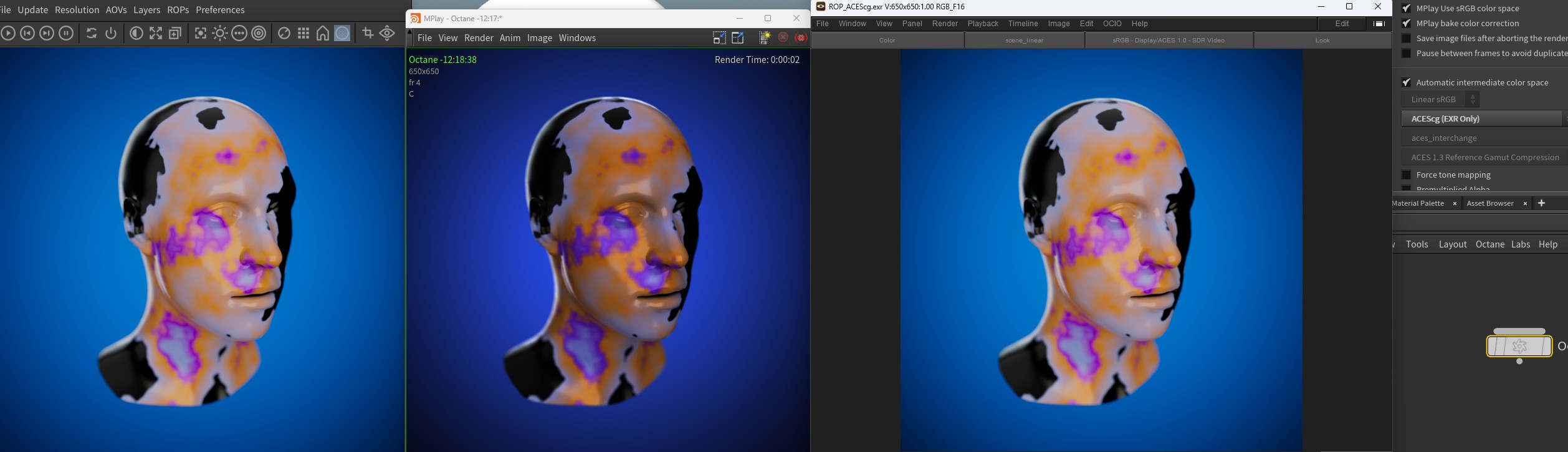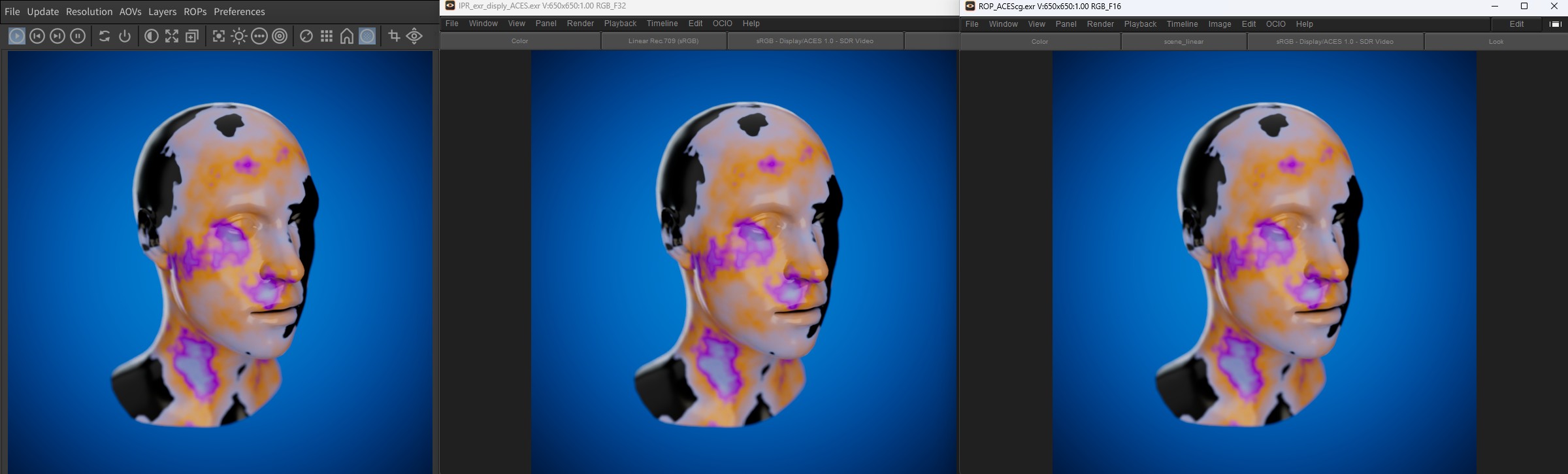 IPR ACES displayed (LEFT) / IPR EXR un-tonemapped (CENTER) with transforms applied / ROP EXR aces with transforms applied (RIGHT) There is a separate output colorspace setting on ROP, but the main reason Mplay looks different is also due to it not having a display transform. Mplay without display transform (CENTER) Hope that makes sense.