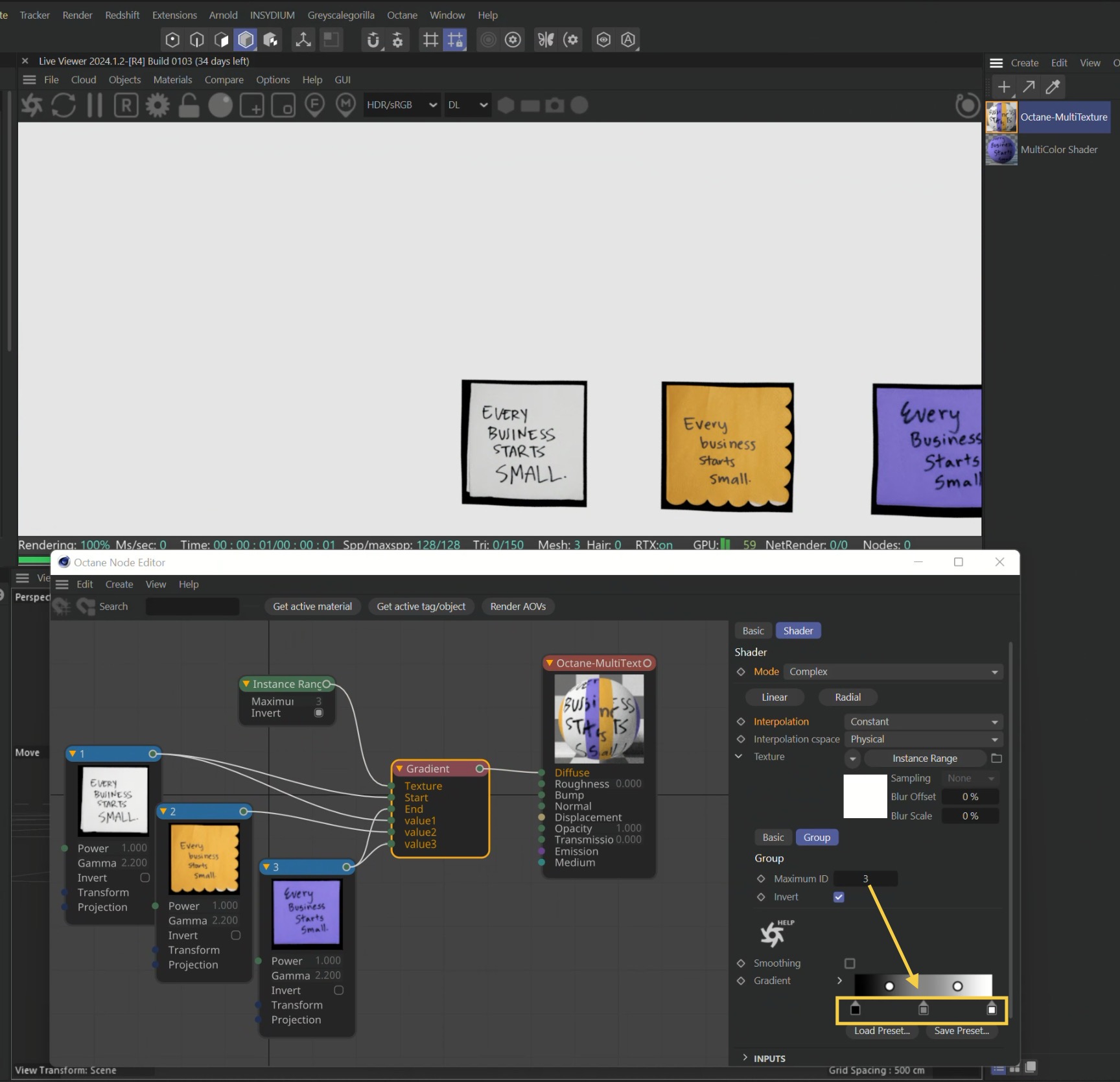 About adding a texture/color to multi texture setup, just click on the gradient to create a new knot: Then right click on the gradient to distribute evenly the knots: Then correct the Instance IDs of the object, ed increase the number of Maximum IDs in thee Instance Range node: Here is the scene: ciao,