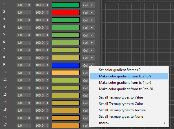 This allows to create colors from first to current, current to last, and a 'start' to current. The 'start' one can be set with the 'Set color gradient Start as ##' option