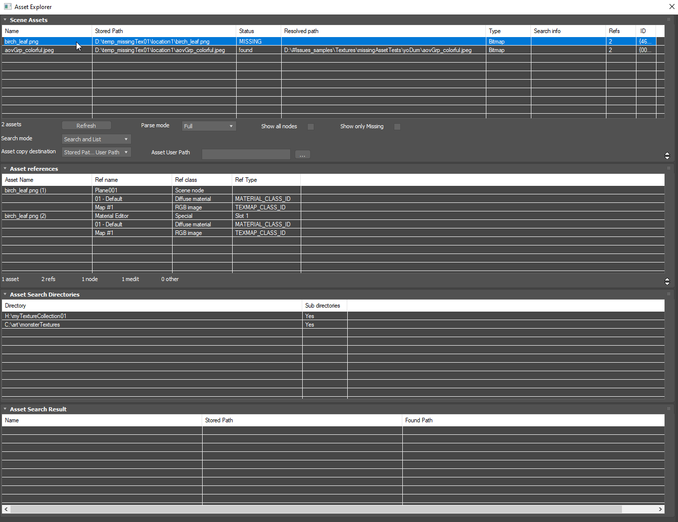 The result will be displayed in the 'Asset Search Result', and in the 'Search info' column of the Scene Assets
