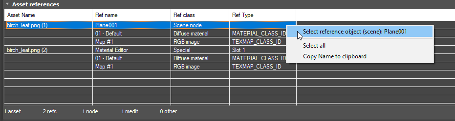 It can also list the asset references like materials and objects, and select them in the scene or material editor.