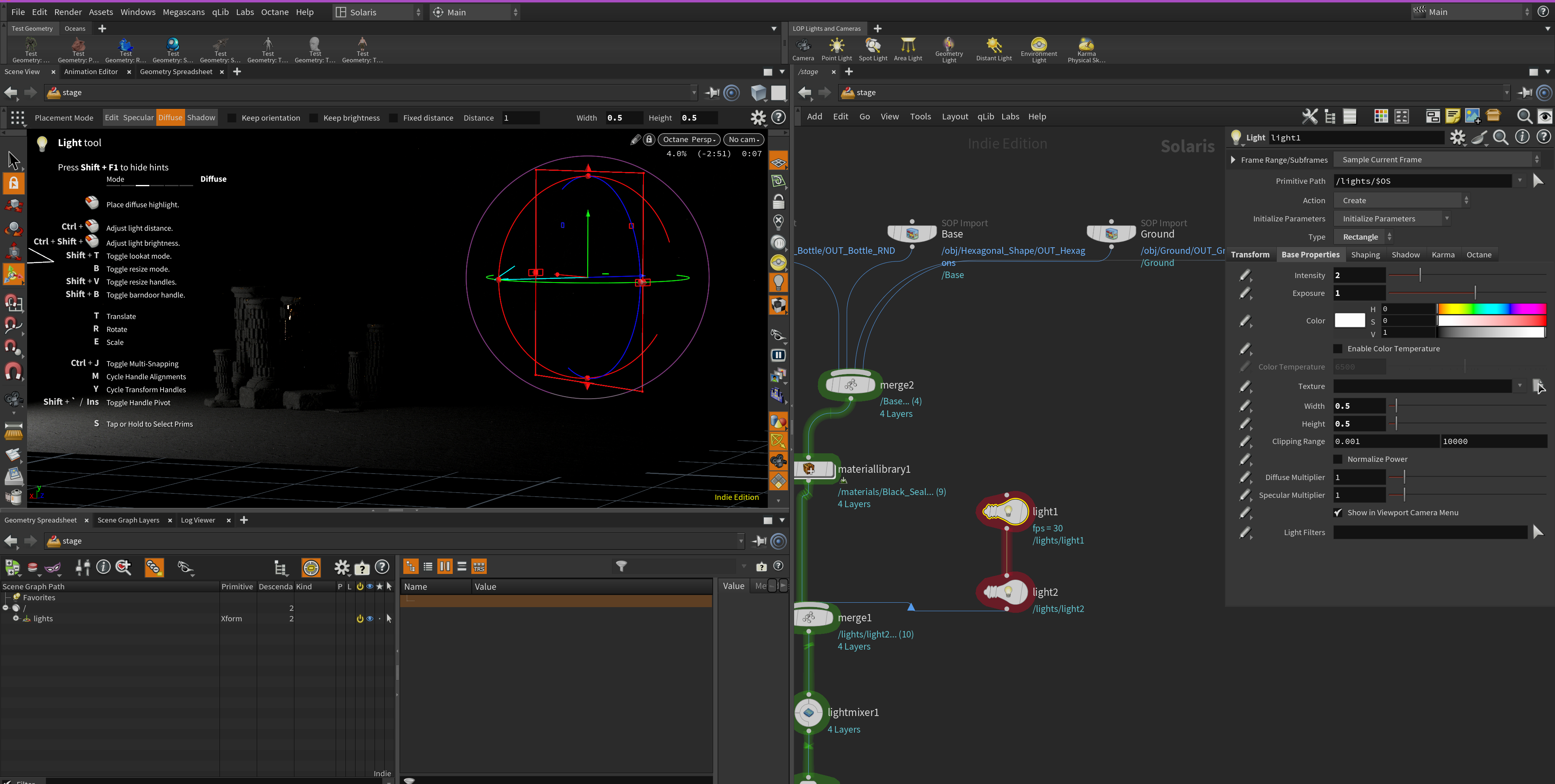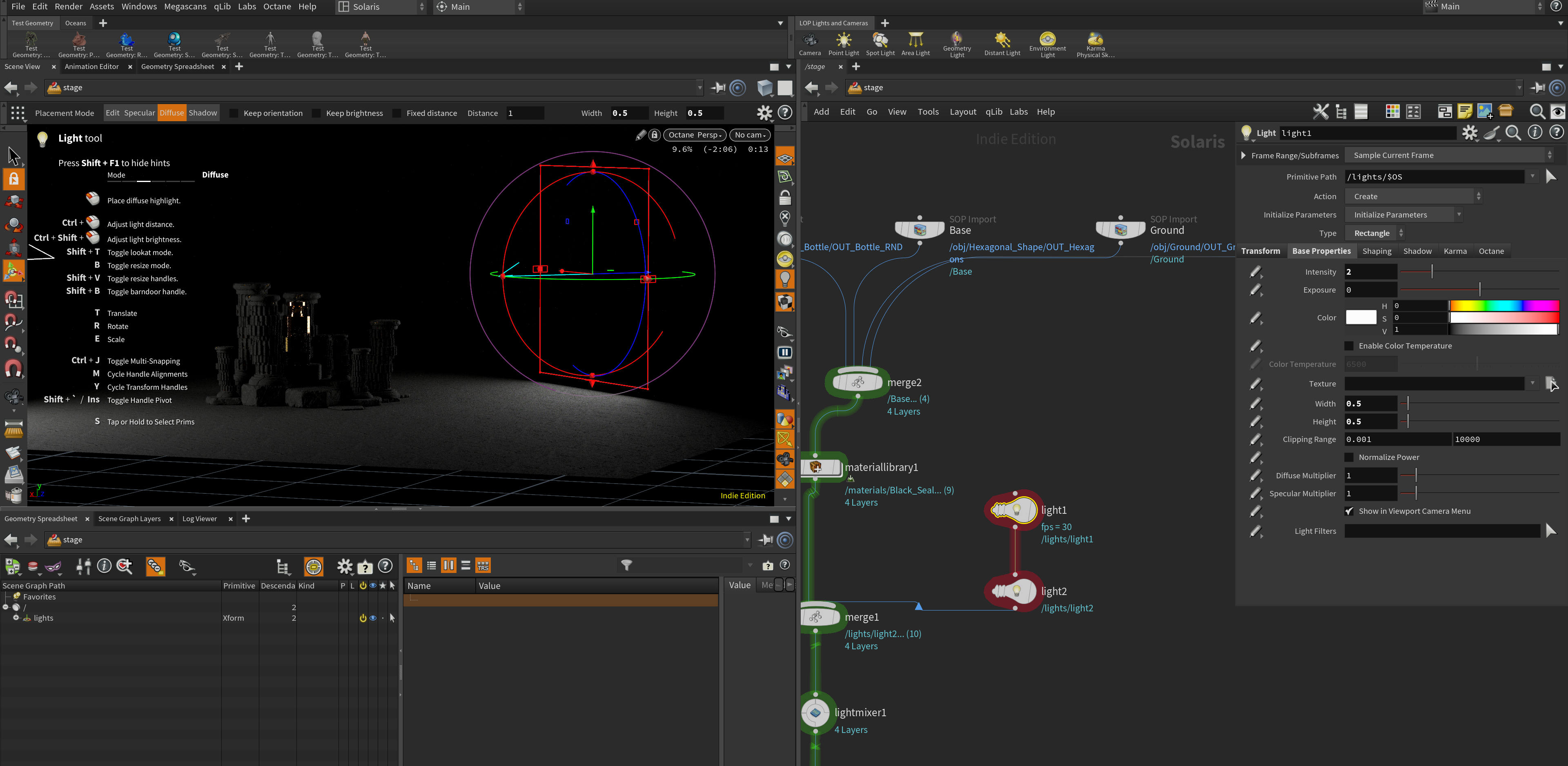 In addition to not being able to use the look at options for lights while in the Octane Render view in Solaris, I came across this bug of a light suddenly not working after just tweaking the exposure value. After this happens, neither intensity or exposure values are registered and the light remains off. Two screenshots are appended so you can see the scene.