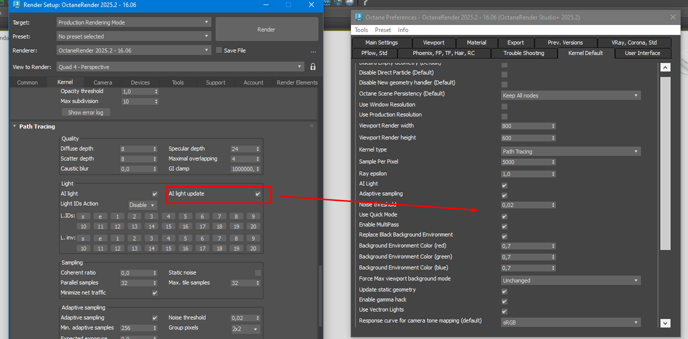 - Added AI Light settings in Kernel tab, in the supported kernel panes (Direct light, Path tracing, PMC)