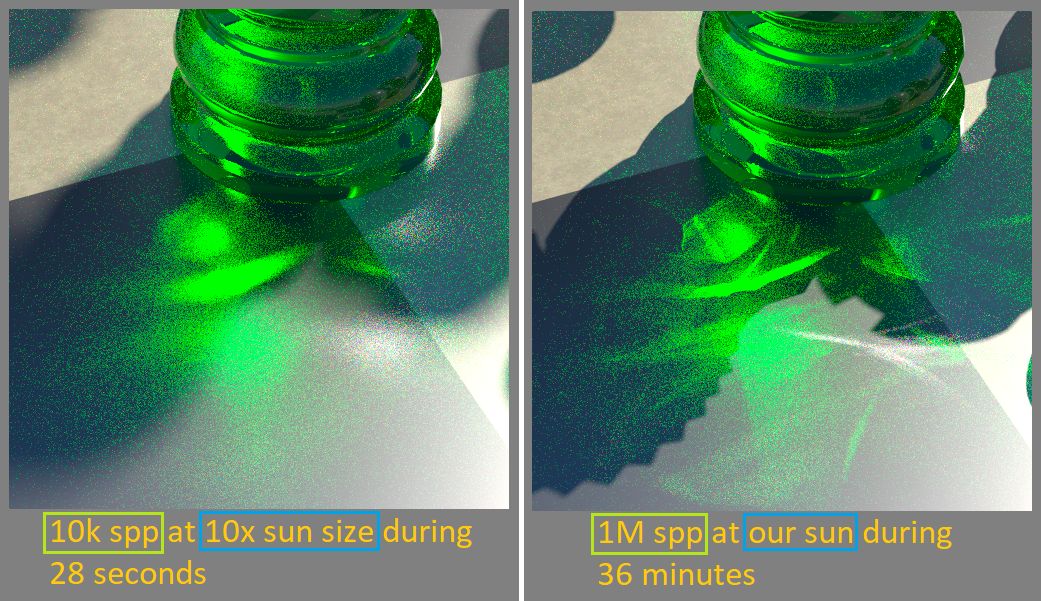 -- Between 2 spp's (samples per pixel) numbers are same noise levels at 2 sun sizes --