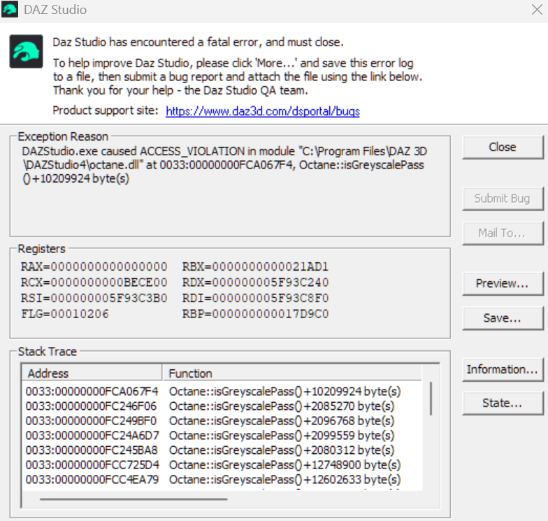 I just got this crash while using this new version of the plugin and while access violation crashes are rather common in Daz Studio, this is the first I've had that lists octane.dll in a long time (years?), as there was a concerted effort to report and fix them all a while back.